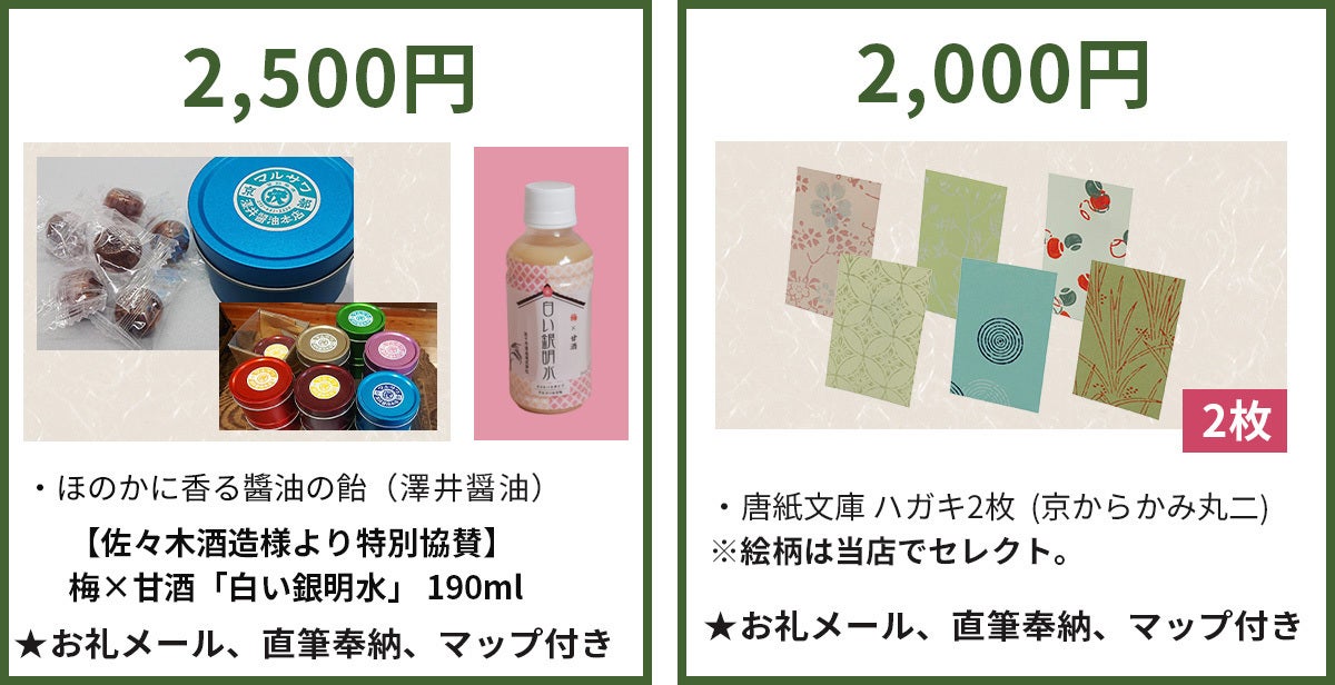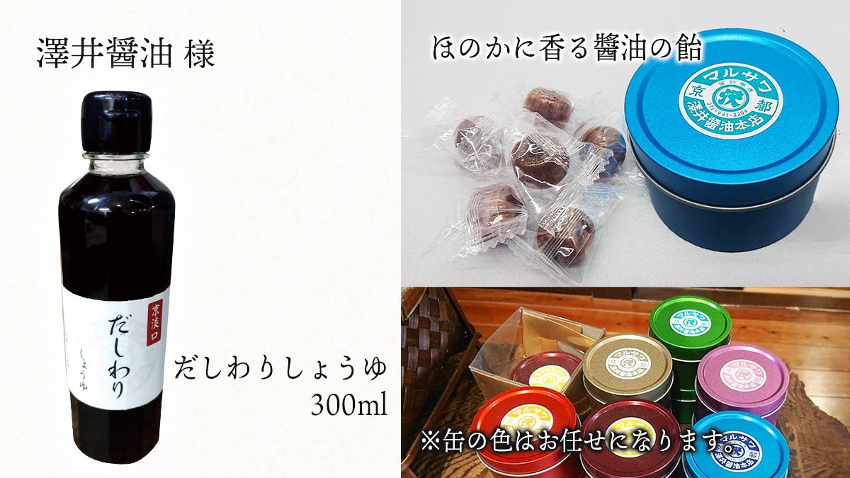 ※リターンには、他に、「ほのかに醤油の香り 醤油の飴」(缶も超かわいいです)、「京淡口だしわりしょうゆ」(澤井醤油様が現在売り出し中)もございますので、ご覧ください。