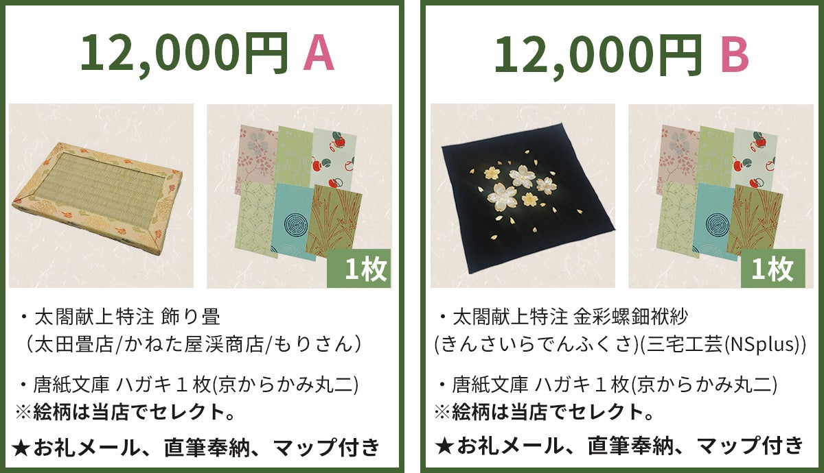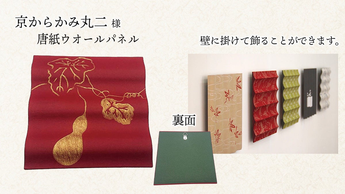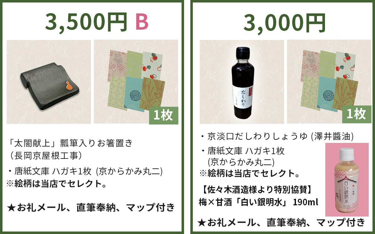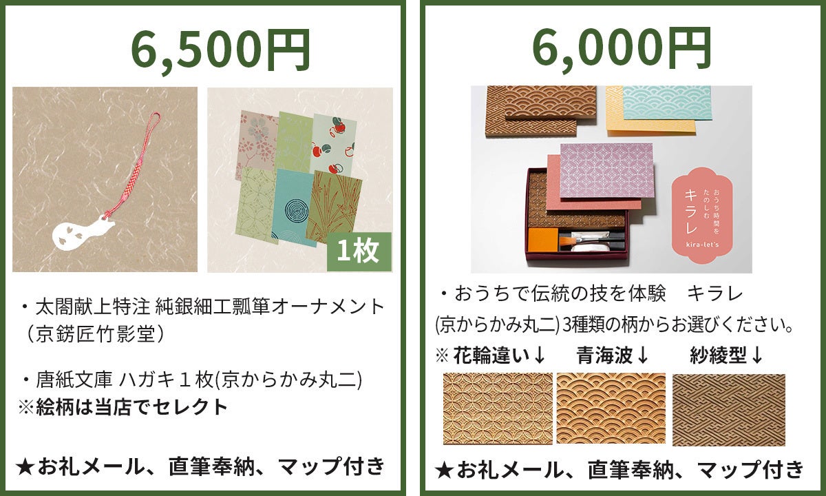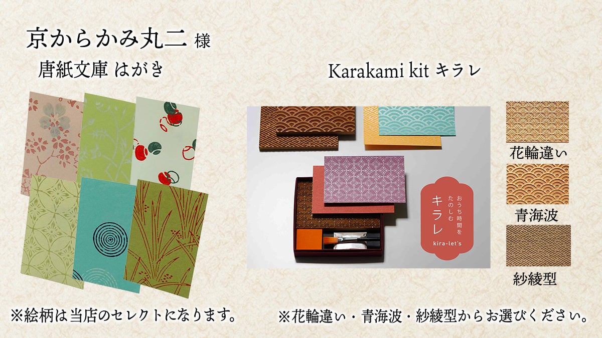 ※リターンには、他に、「唐紙文庫 はがき」(写真立てに入れてインテリアとしても楽しむことが出来ます。絵柄は当店のセレクトになります。)、 「おうちで伝統の技を体験 キラレ」(ご自宅で伝統工芸品、京からかみを体験できるキットです。花輪違い・青海波・ 紗綾型 の三種類よりお好きな文様をお選びいただけます。)もございますので、そちらもご覧ください。
