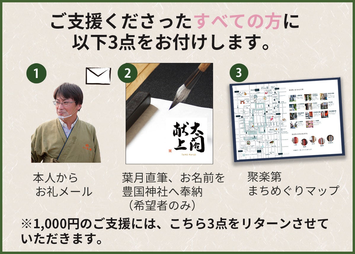 その先も多くの支援頂ければ、「太閤献上」のキーワードを軸に、地域活性化策を模索していく計画も考えにはあり、支援頂いた皆様のご厚意に必ず応えていくことをお約束します。