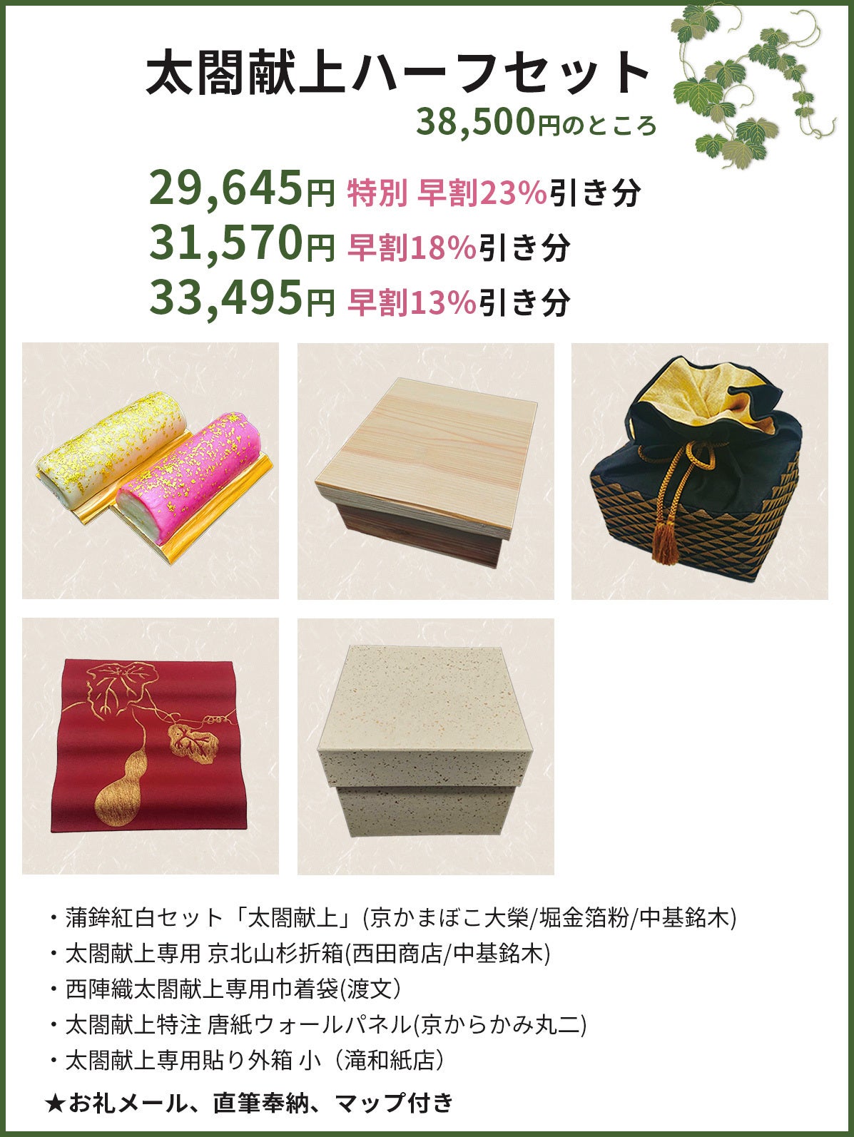ハーフセットは、 23%引きの、特別早割29,645円から、