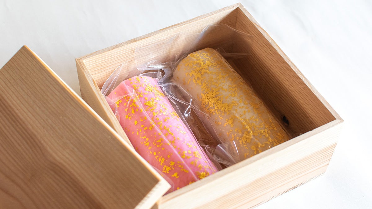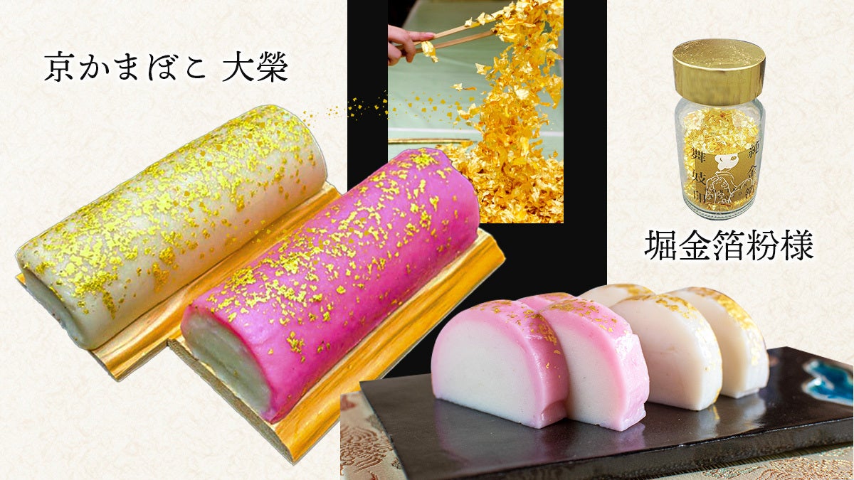 かまぼこの表面には、太閤殿下が好まれていたとという金を、聚楽第の金箔瓦もイメージしつつ、たっぷりとあしらいます。創業310年、京都で金といえばここ、堀金箔粉様より最高級の金粉を供給いただき、美しく華やかな蒲鉾に仕上げます。
