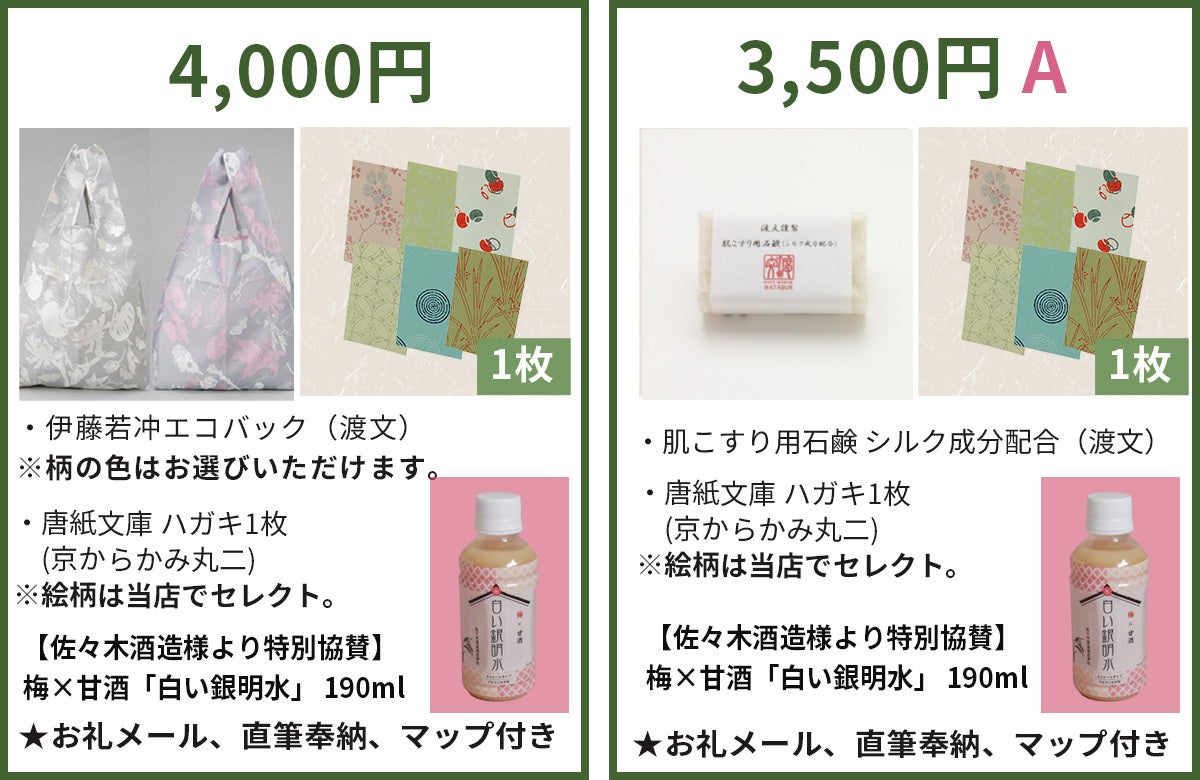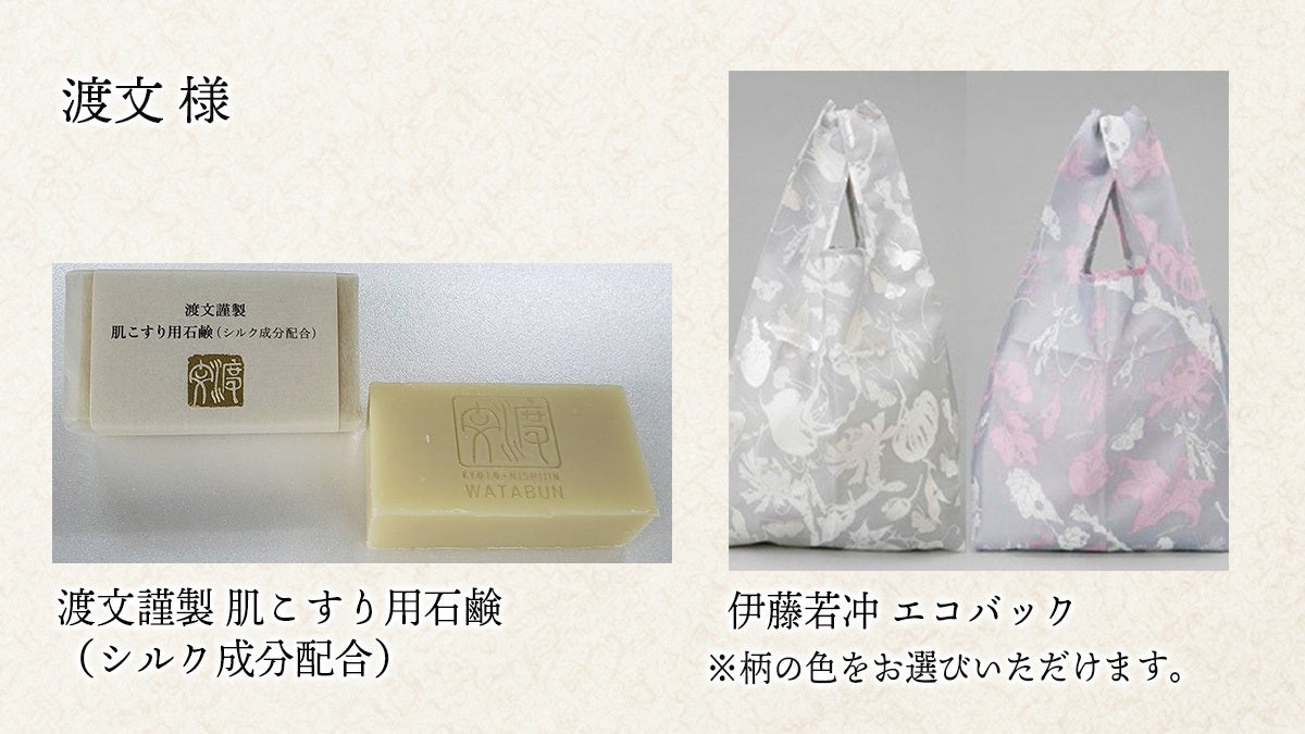 ※リターンには、他に、「肌こすり用シルク石鹸」(聞いただけでお肌スベスベ)、「伊藤若冲エコバック」(とってもおしゃれ!プレゼントにも喜んでもらえそうですね)もございますのでそちらもご覧ください。