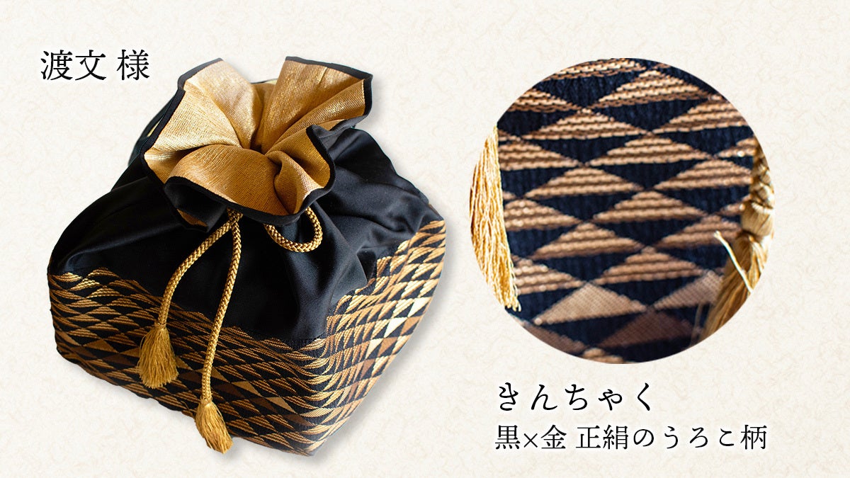 聚楽第周辺は西陣織の産地。主業の帯から、自由な発想と想像力で、最新の技術にも挑戦されている渡文様に、専用の巾着袋をお願いしました。
