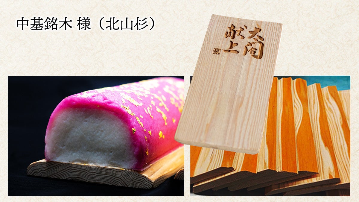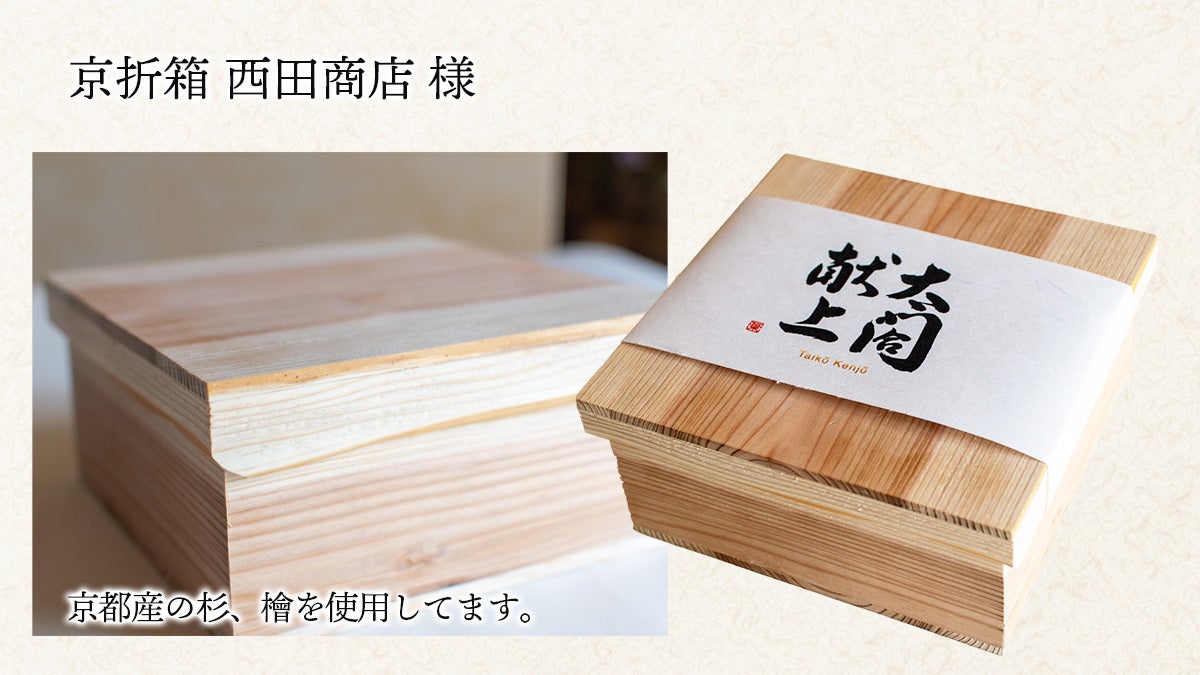 中基銘木様に北山杉を原木から切り出していただき、料亭のおせち用折箱等の製造職人、西田商店様に専用の折り箱を作っていただきました。