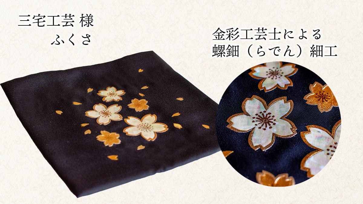 花嫁打掛等の金彩工芸の職人であります、三宅工芸(NSplus)様により、黒の正絹に秀吉の花見会をイメージして、桜の花を金彩と螺鈿(らでん)をあしらい、華やかで格好よく仕上げていただきます。