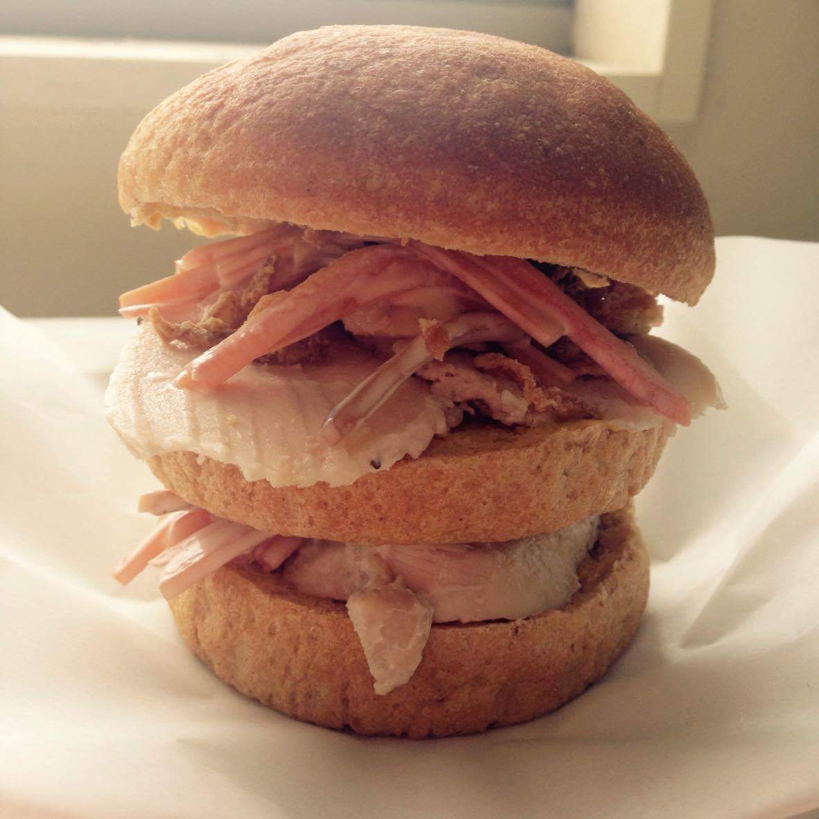 「サゴハチ鶏ハムとイカ人参の 米粉パンバーガー」