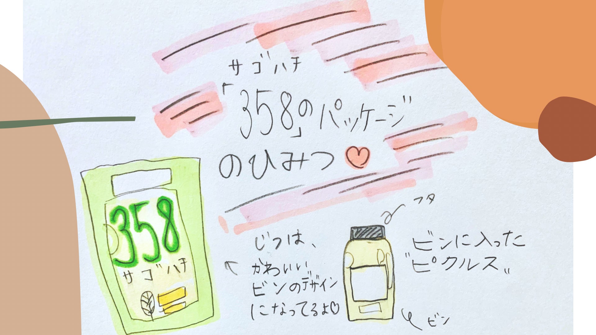 「358サゴハチ」のパッケージについて♡みどりのパッケージには、ひみつがあります!ただのミドリと358だけじゃないんですよ?!見つけました?カワイイ、保存ビンをイメージしてます。上の白い部分が、保存ビンのふたです。保存ビンの中に、お野菜がちょこんと入っています。きゅうり・にんじん・セロリ・レンコン・パプリカなどなど、パッケージの中の絵を見てみて下さいね♪御稲プライマル二瓶