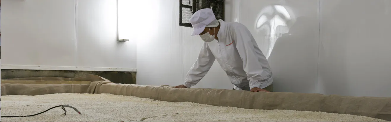 布で包んで一晩、ゆっくり醸したら、翌朝7時には麹の塩梅を確かめます。季節によってその日の天気によって変わる麹のはぜ込み具合。その時々で見極めるのが匠の技。