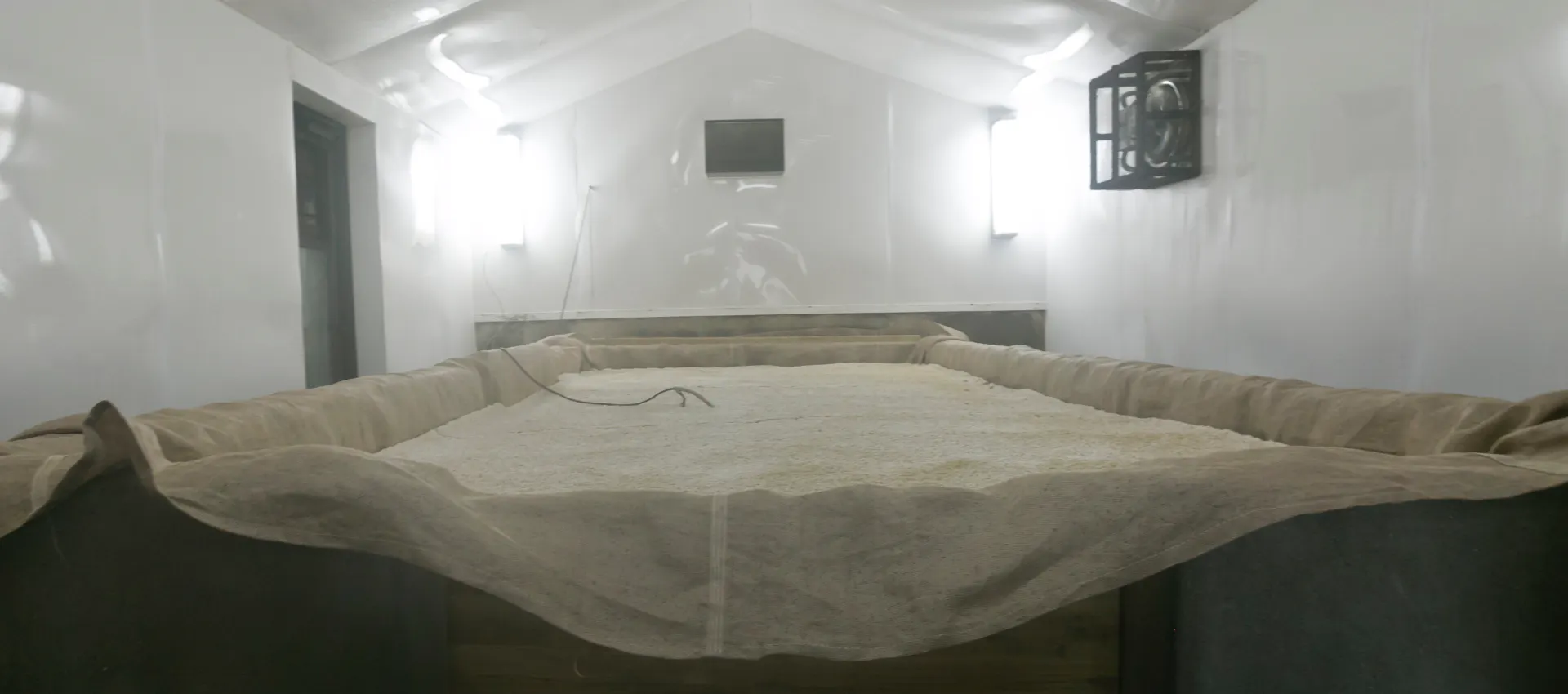 近隣の畑で丹精込めて育んだ大麦。その大麦を浸漬し、蒸し上げます。10畳ほどの室に移し、麻布の床の上に蒸し大麦を広げます。麦が人肌まで冷めるのを待って振り入れる味噌用種麹。大麦一粒一粒に麹が付くよう丹念に切り返します。室の温度は30度以上、冬でも汗をかく作業です。