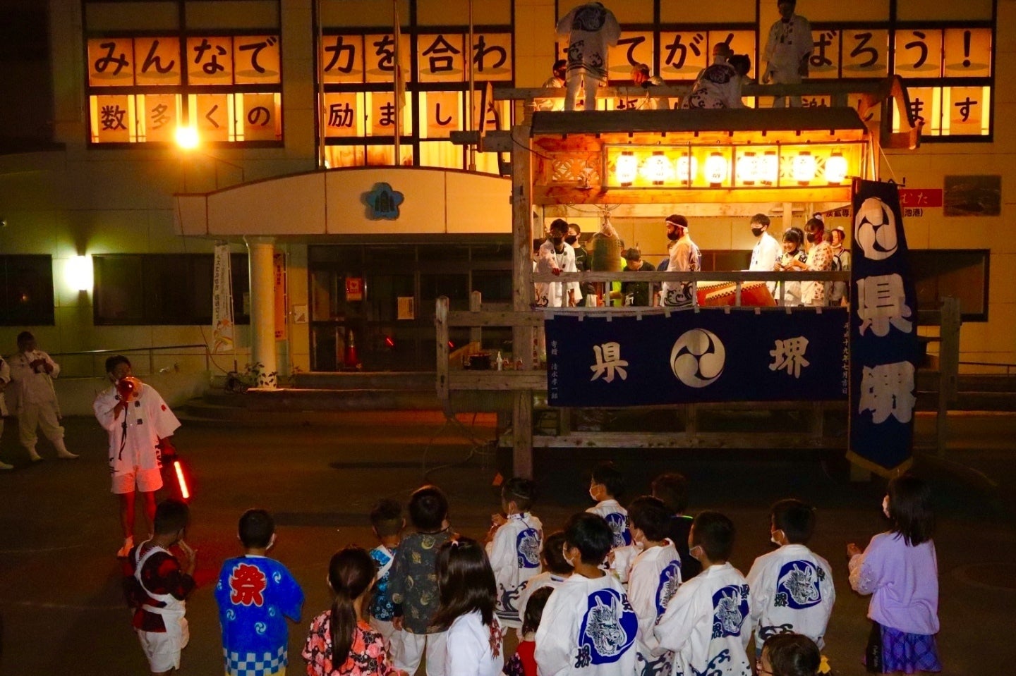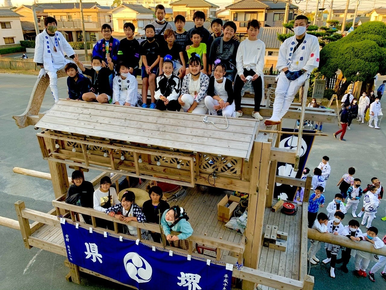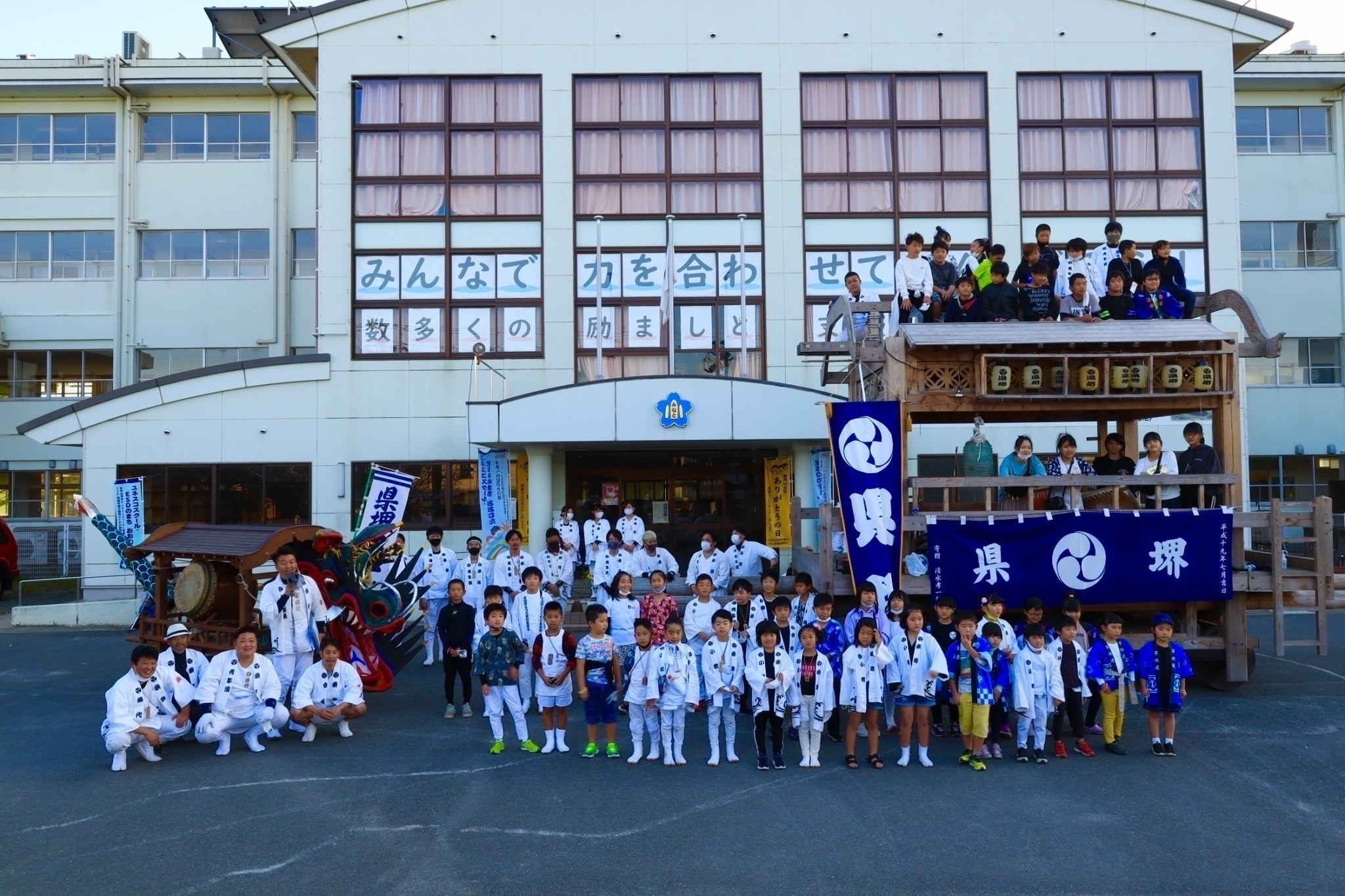 そこで、県堺大蛇山として何かできないかと考え、みなと小学校の子どもたちの思い出づくりプロジェクトとして、感染防止を施し、小さな大蛇山ではありますが、子どもたちが主役となって大蛇山をひく地域巡行や、お菓子や文具などのプレゼントをさせていただきました。