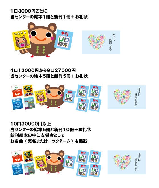 支援額に応じて新刊とランダムですが当センター発行のUD絵本をお届けいたします。
