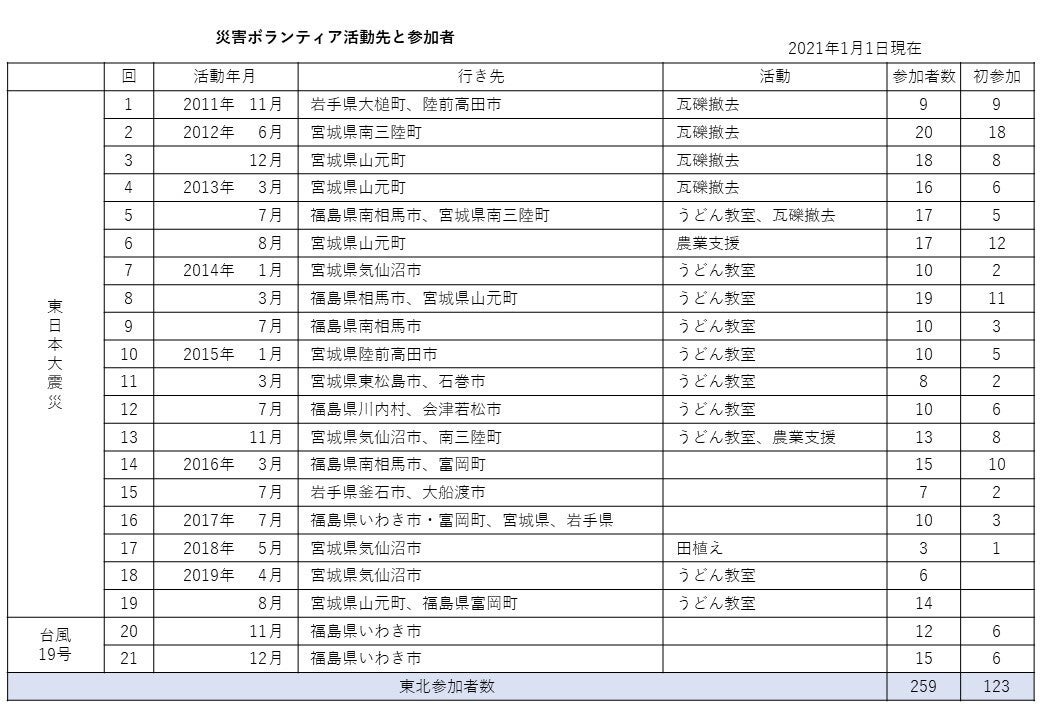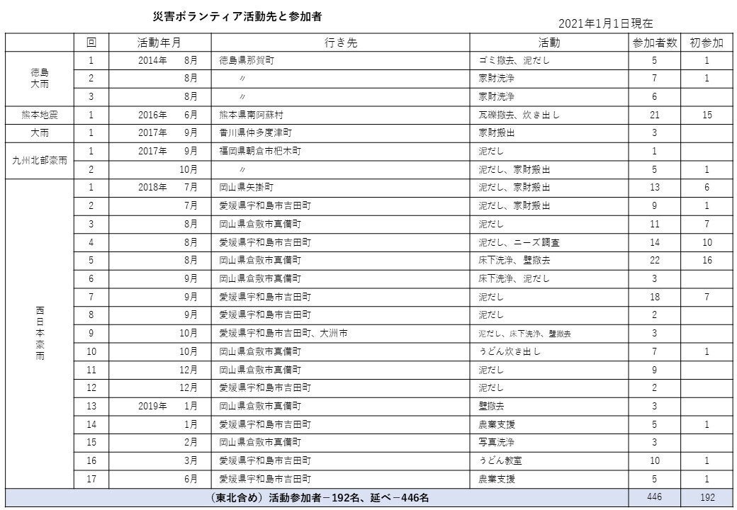 四国から1,000キロ以上離れた東北へのボランティア活動も10年目、東北への訪問は20回を超え、東北をはじめ各被災地での災害ボランティアに参加した人数は192人、のべ446人が活動しました。