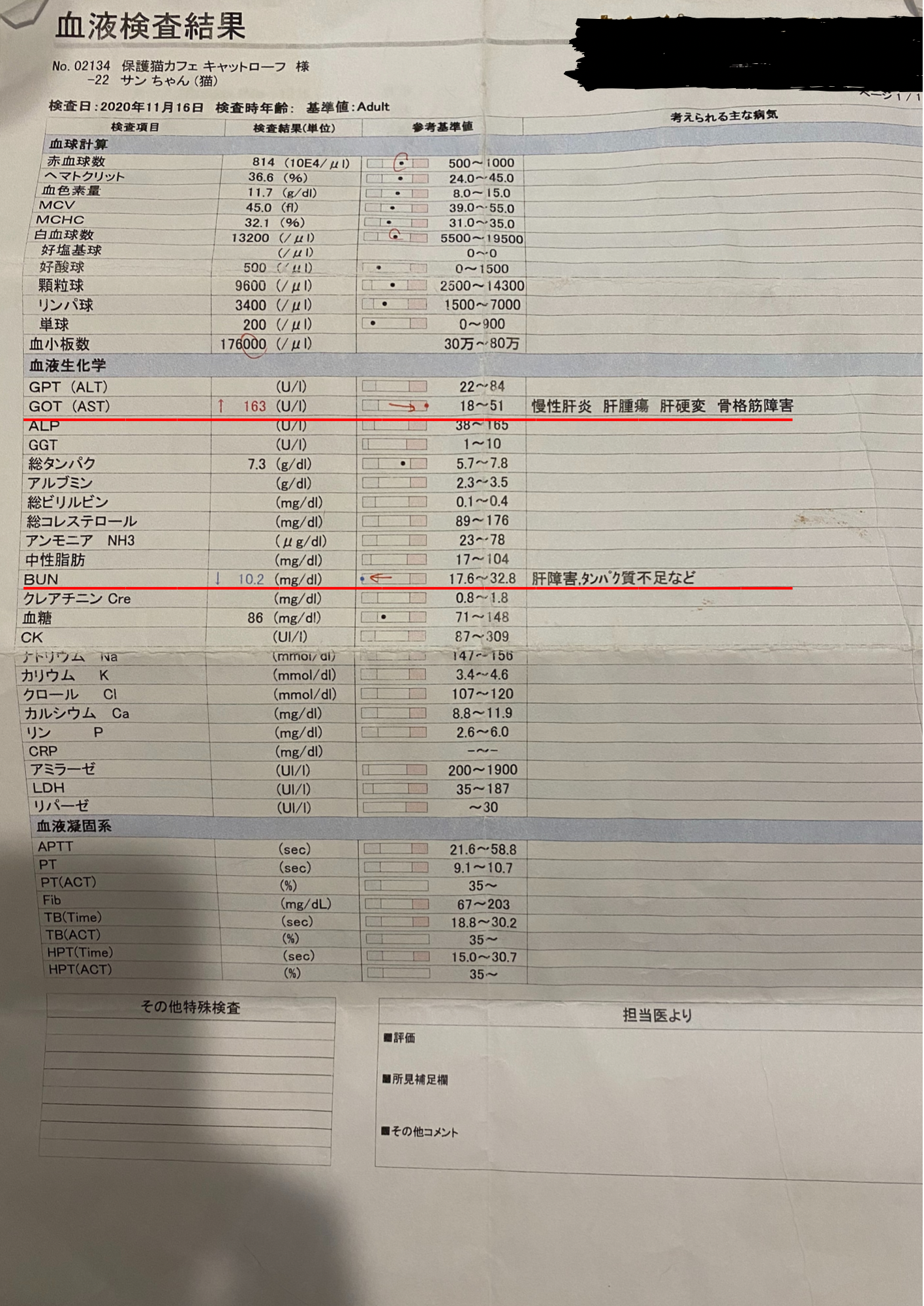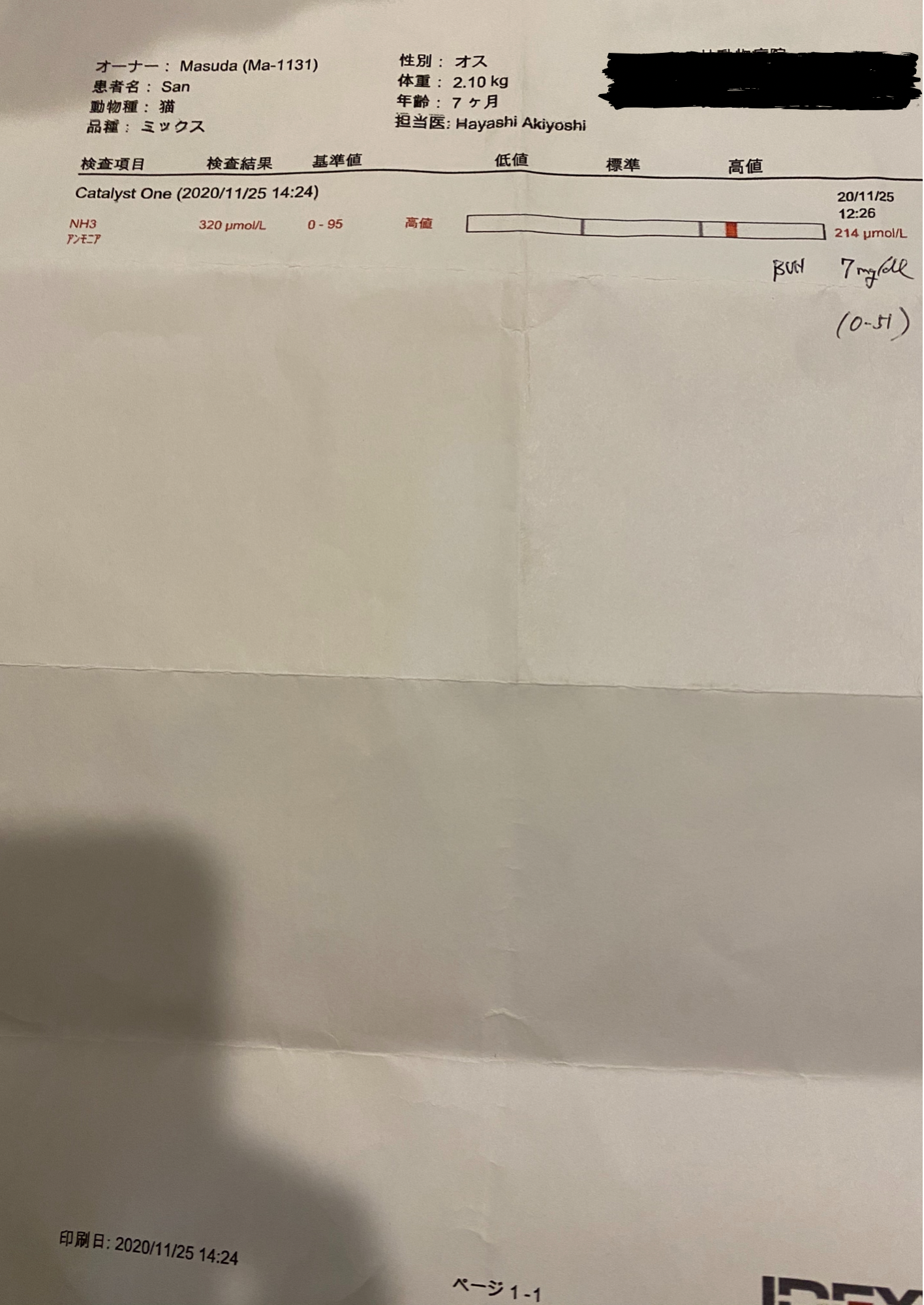 令和2年11月25日 肝門脈シャントの可能性を調べる為に、絶食時と食後のお写真でのアンモニアの数値を調べる血液検査。