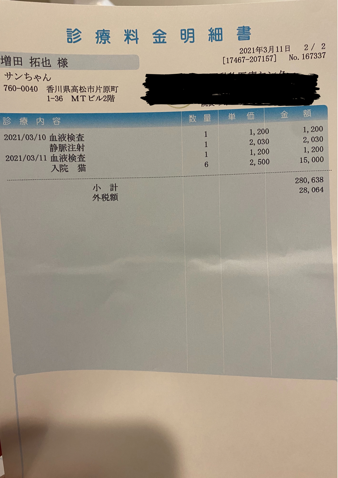 3月5日手術、入院代(3月11日支払い)