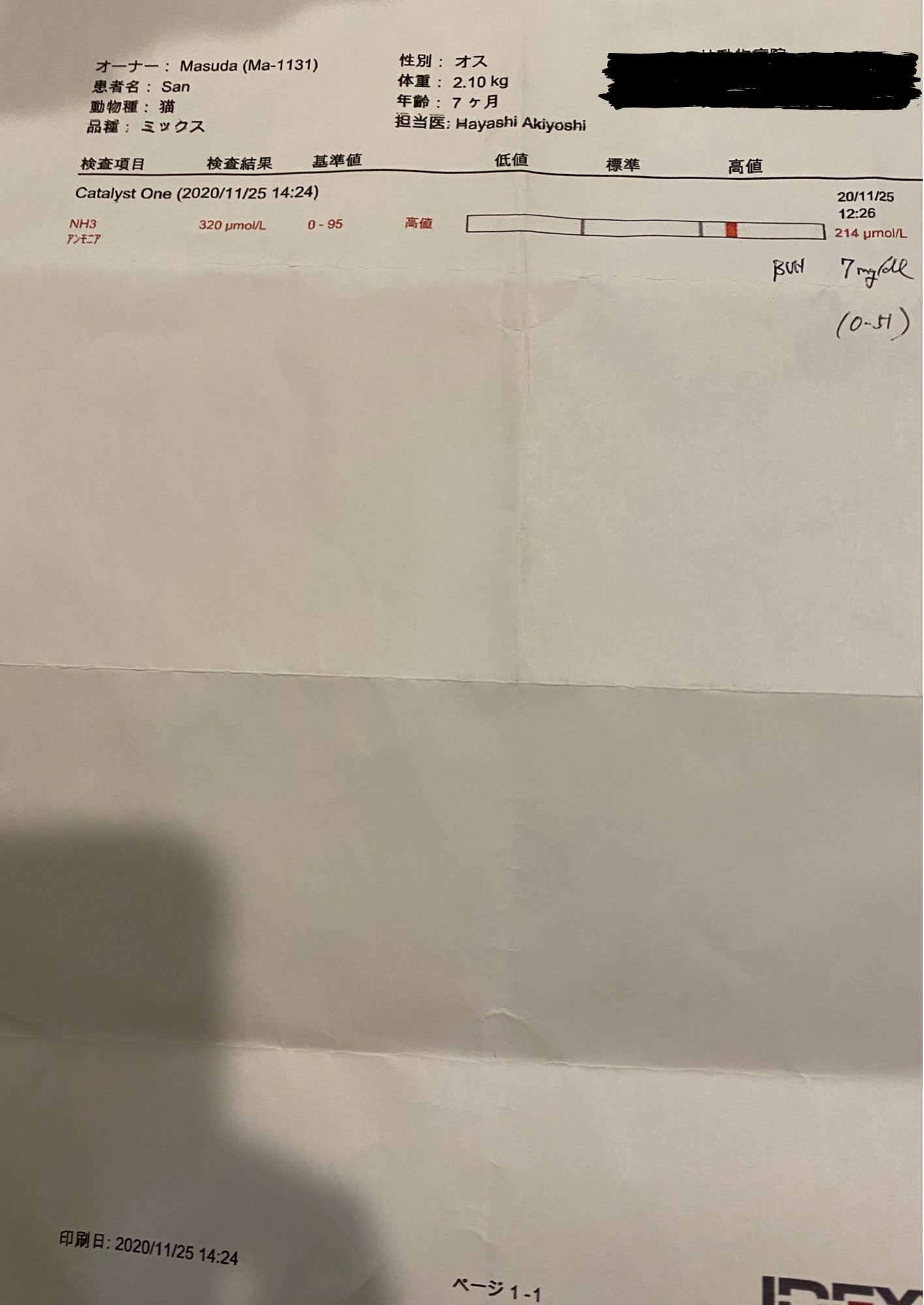 令和2年11月25日 肝門脈シャントの可能性を調べる為に、絶食時と食後のお写真でのアンモニアの数値を調べる血液検査。