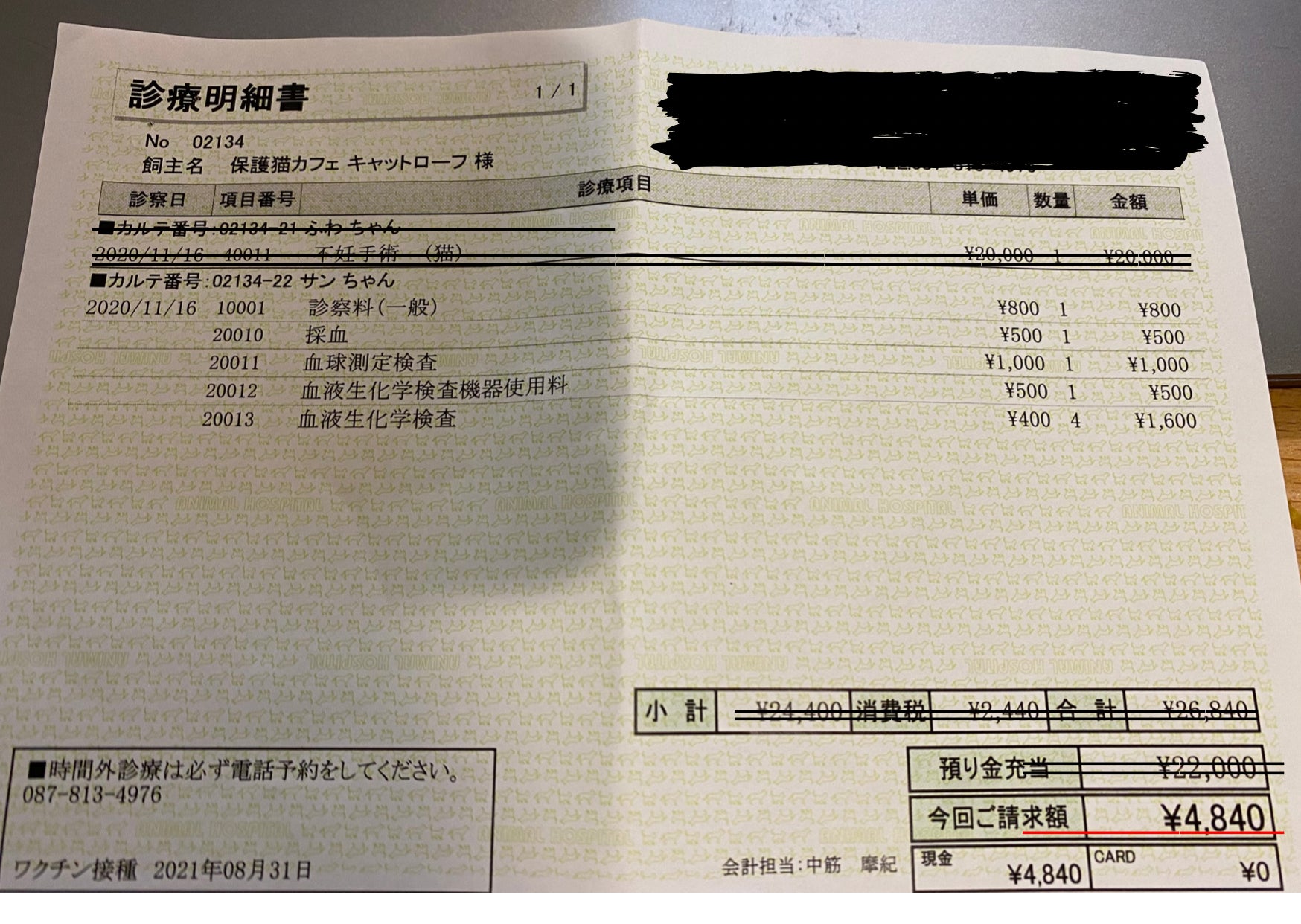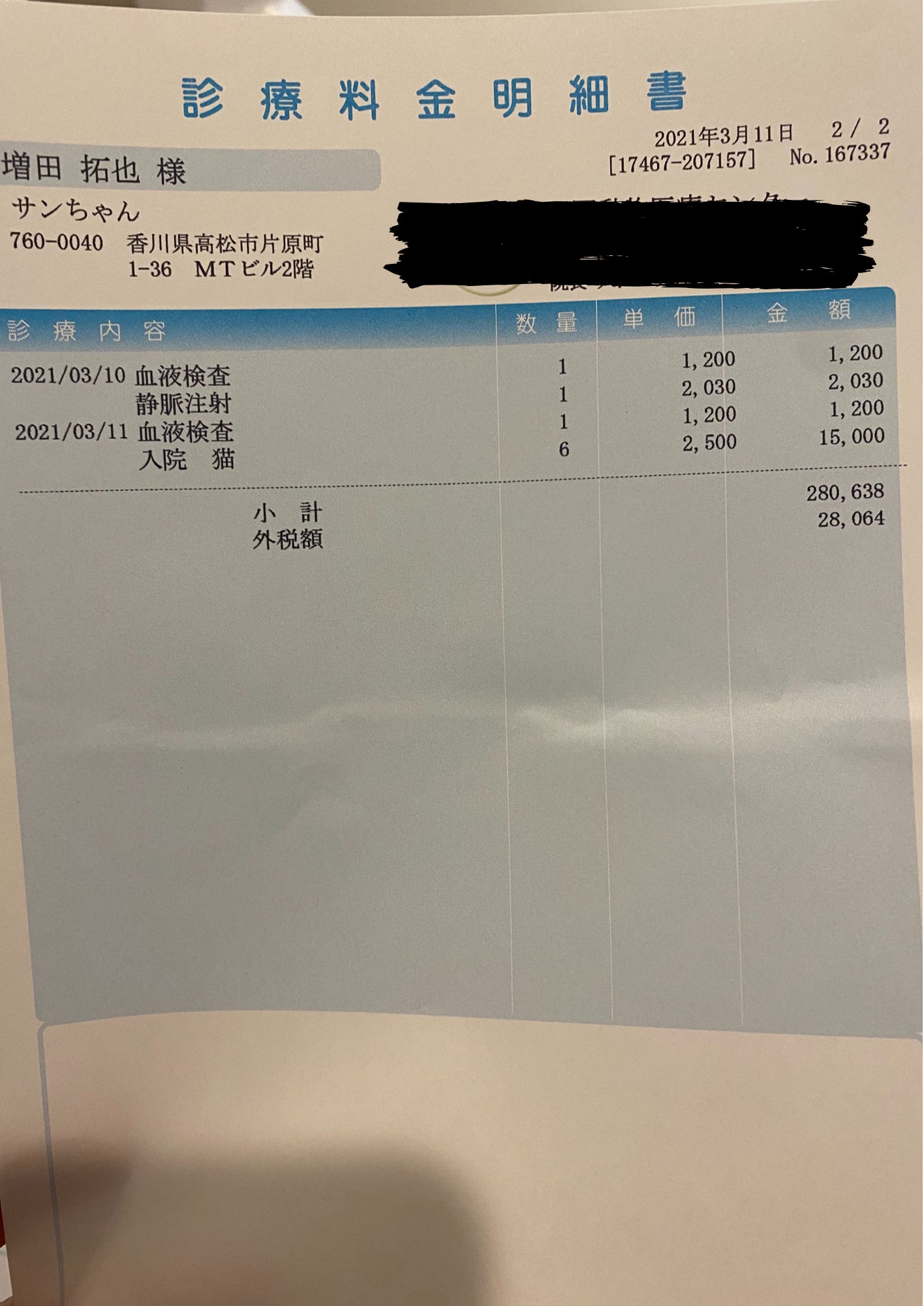 3月5日手術、入院代(3月11日支払い)