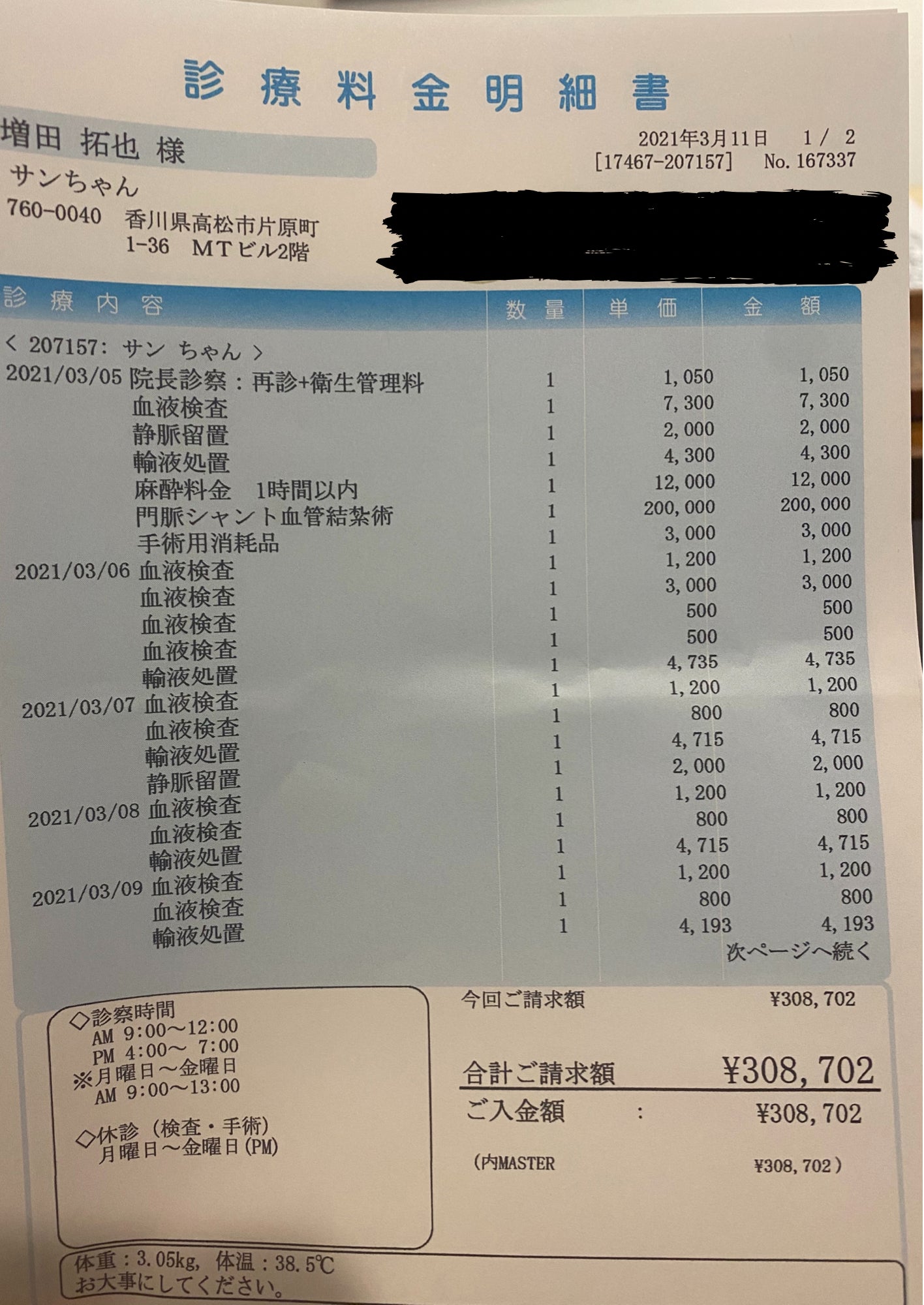手術代 308,702円(3月5日実施)