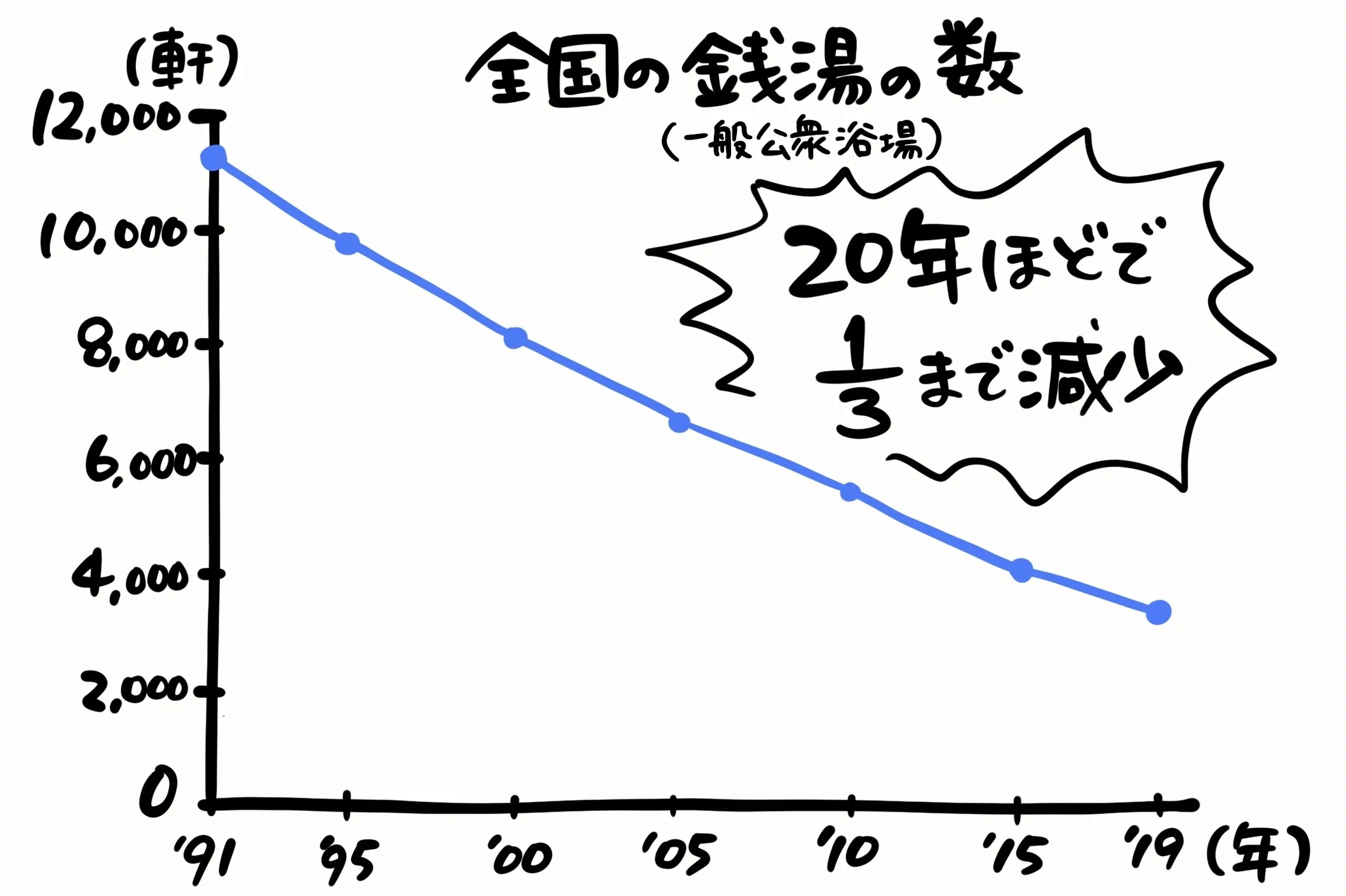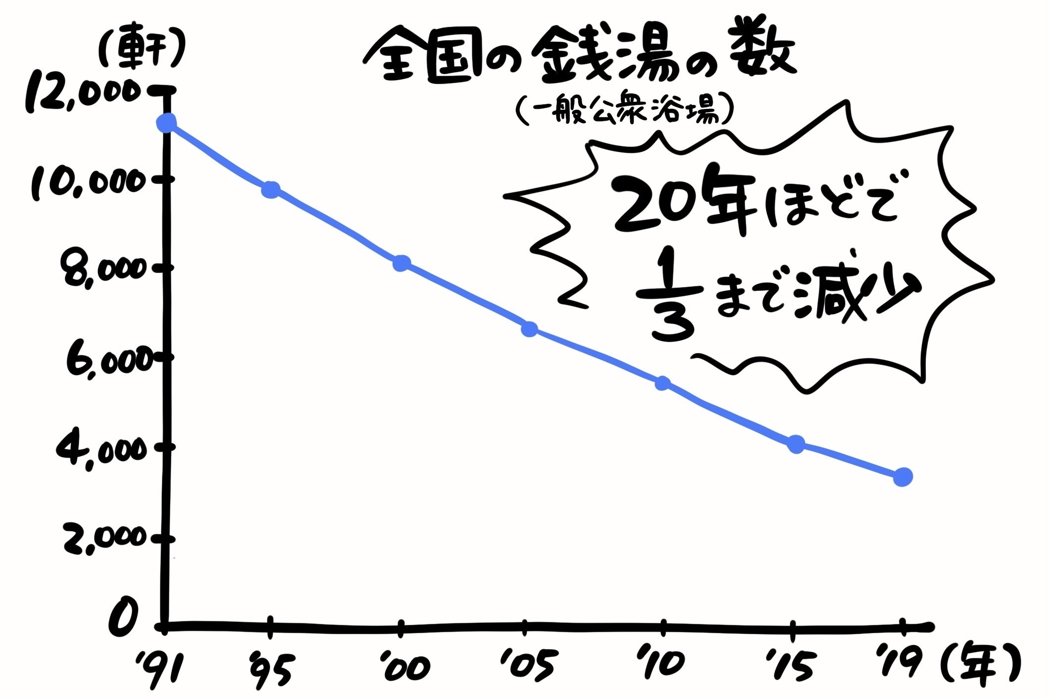 日本中で銭湯の数は激減しており、ここ20年ほどで、3分の1にもなっています。