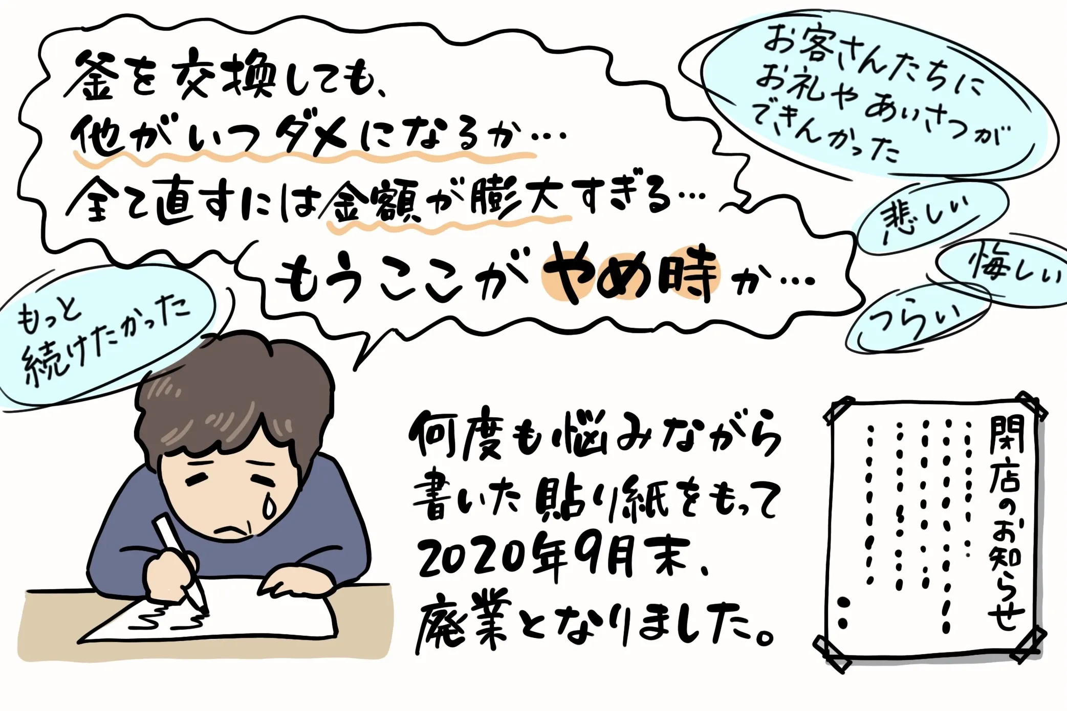 営業中に釜(ボイラー)が故障し、臨時休業を経て、悩んだ末に廃業という。