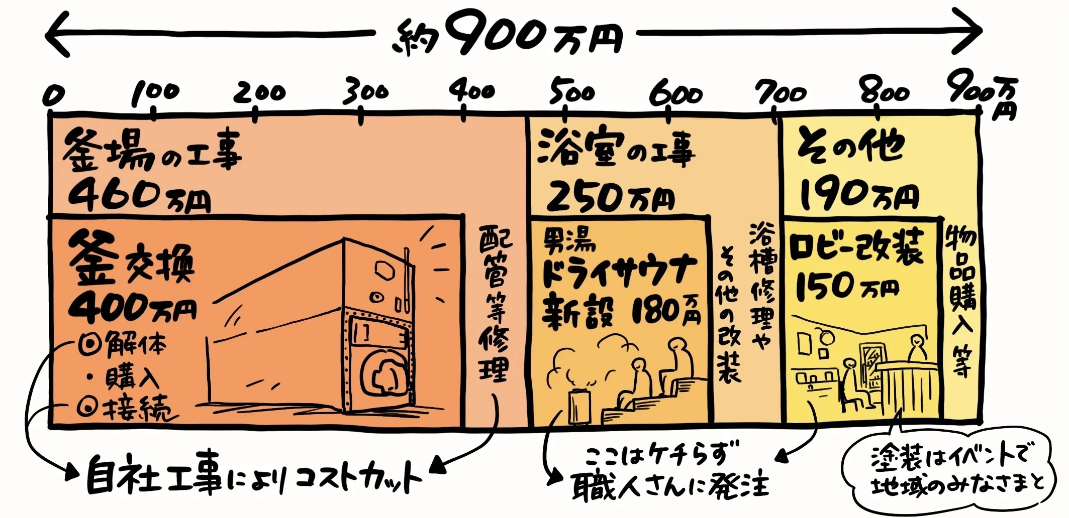 人蔘湯復活にかかる費用は約900万円にのぼります。この金額を投じてでも、人蔘湯は残す価値があると判断しました。
