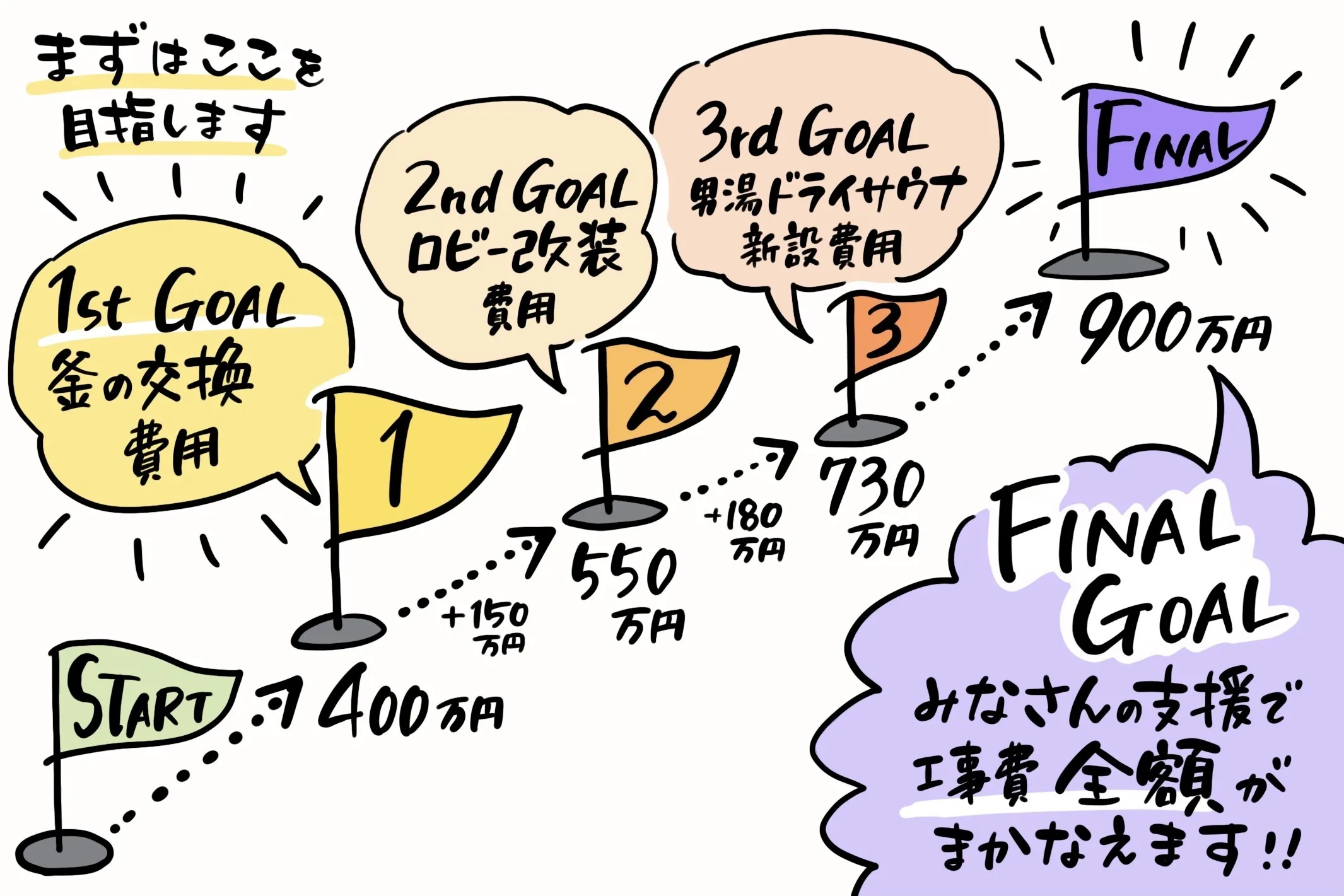 とはいえ、ゴール金額400万円は総額の一部にすぎません。達成できた暁には、さらに上を目指していきます。