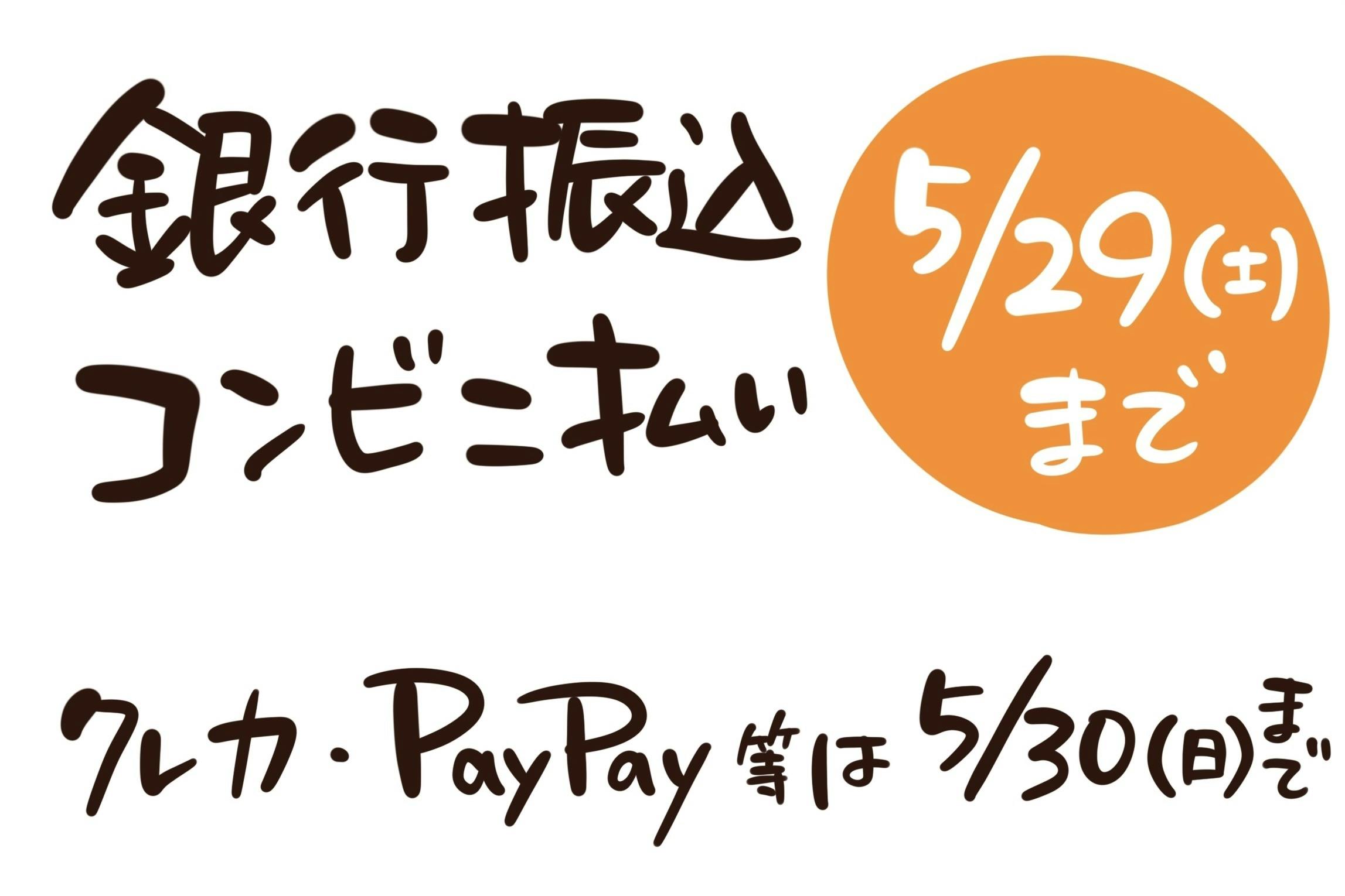 2021/05/28 17:41本プロジェクトをご覧くださりありがとうございます!お支払い方法によって、期限が設定されていますのでご注意ください。◆銀行振込、コンビニ払いご利用期限:5月29日(土)18:00までお支払期限:5月29日(土)23:59:59まで銀行の窓口・ATMのご利用時間帯もご確認ください。(土曜日は終わるのが早いかもしれません)◆その他のお支払い方法最終日5月30日(日)までご利用可能です。クレジットカード、PayPayなどをお選びいただけます。銀行、コンビニをご利用予定の方はお気をつけください。最後までどうかお力添えをよろしくお願いいたします! もっと見る