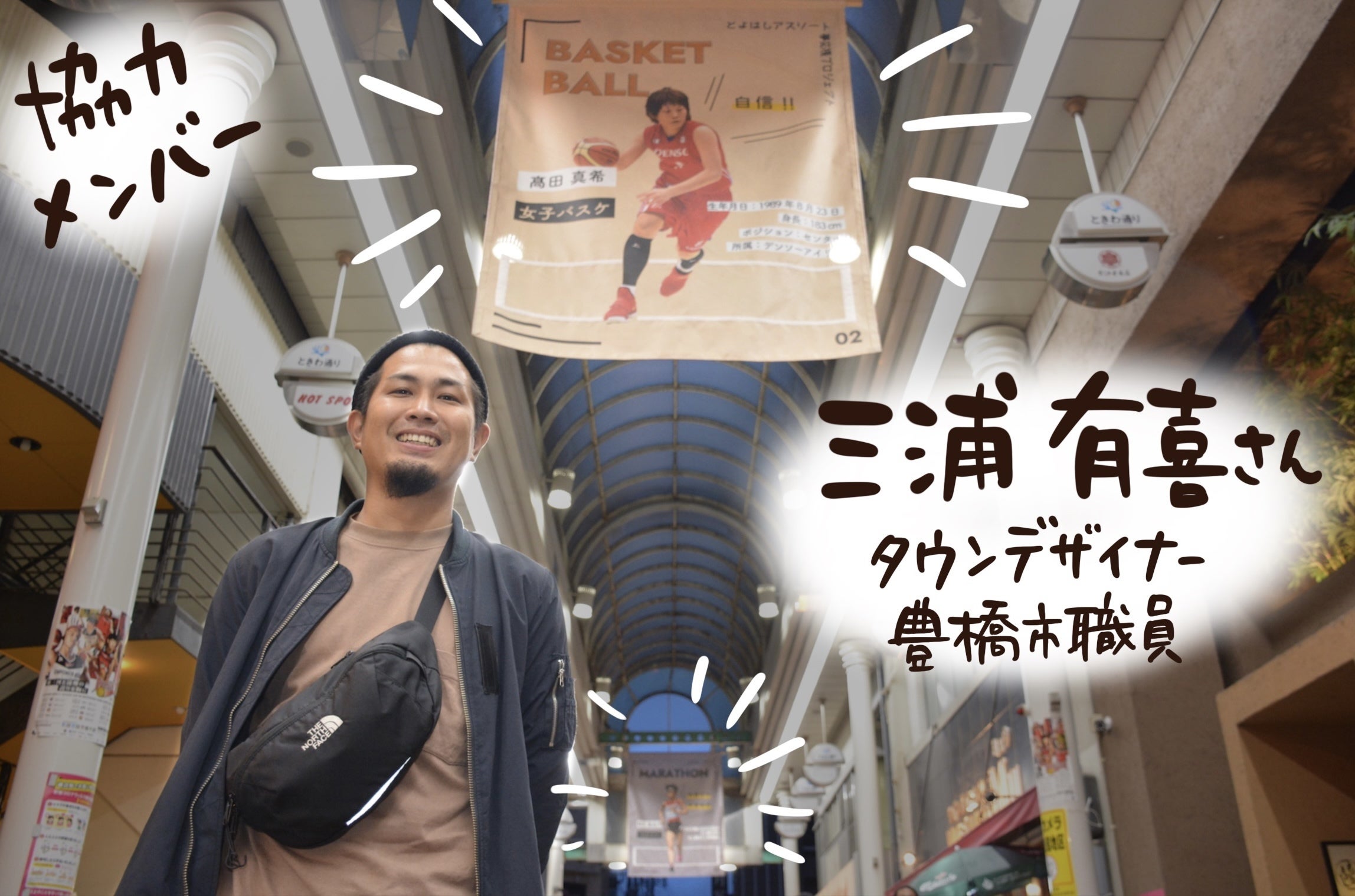 デザインを担当された「とよはしアスリート夢応援プロジェクト」ときわ通りフラグの前で