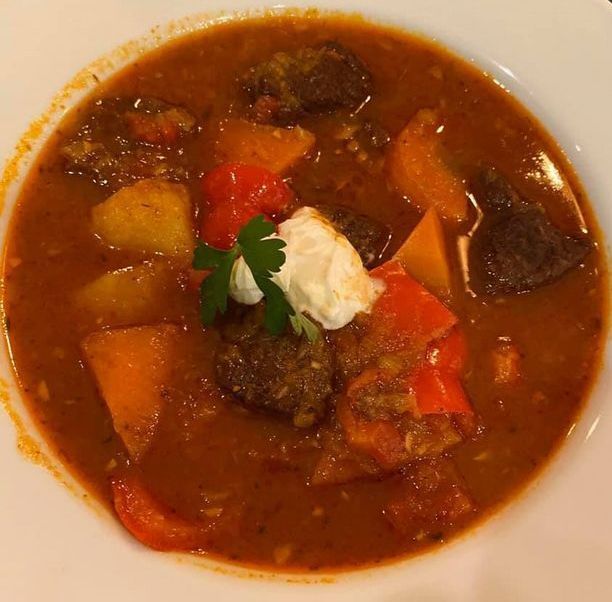 最初の写真はハンガリーの伝統的な煮込み料理の グヤーシュ です。グラーシュなどと地域でいくつかの呼び名がありますが、牛肉、パプリカ、玉ねぎ、じゃがいもなどを使った バイスル の看板メニューです。