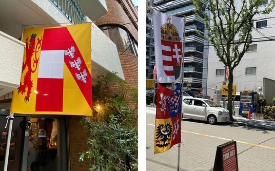 この旗はどこの国旗ですか? と聞かれますが、これらは国旗ではなくオーストリアのハプスブルク・ロートリンゲン家の紋章とチェコとハンガリーの国章です。