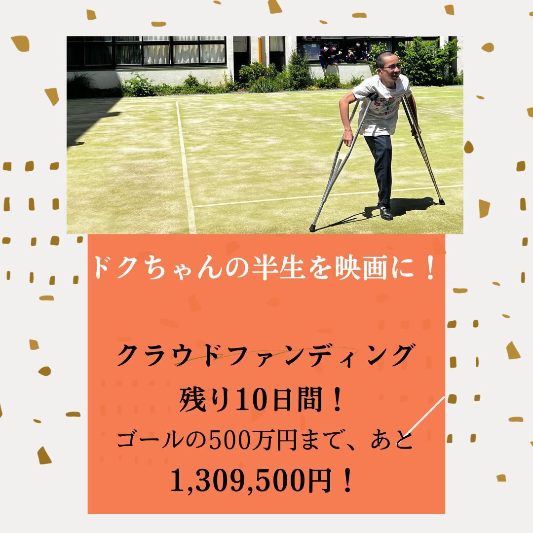 ドキュメンタリー映画「ドクちゃん(仮題)」のクラウドファンディング終了まで、あと3日となりました。画像に「あなたの名前を刻みませんか?」とありますが、リターンの種類に「映画のエンドクレジットにあなたの名前を掲載」というものがあります。劇場上映される映画のエンドクレジットに、このリターンを選ばれた方の名前が掲載されます。3万円からこのリターンを選べます。目標金額500万円まで、あともう少しです。ご支援よろしくお願いいたします。●ドクちゃんの半生を長編ドキュメンタリーで初の映画化!●クラウドファンディング募集中!https://camp-fire.jp/projects/view/703859【募集期間】2023年10月4日~11月18日