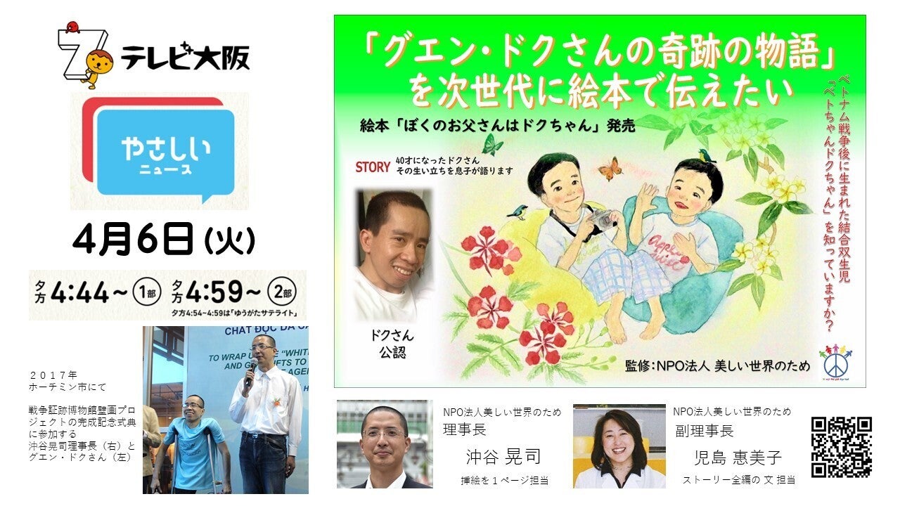 絵本「ぼくのお父さんはドクちゃん」について、4月6日(火)午後4:44~テレビ大阪「やさしいニュース」にて放映していただく予定です。(※ニュースなので変更もありえます)