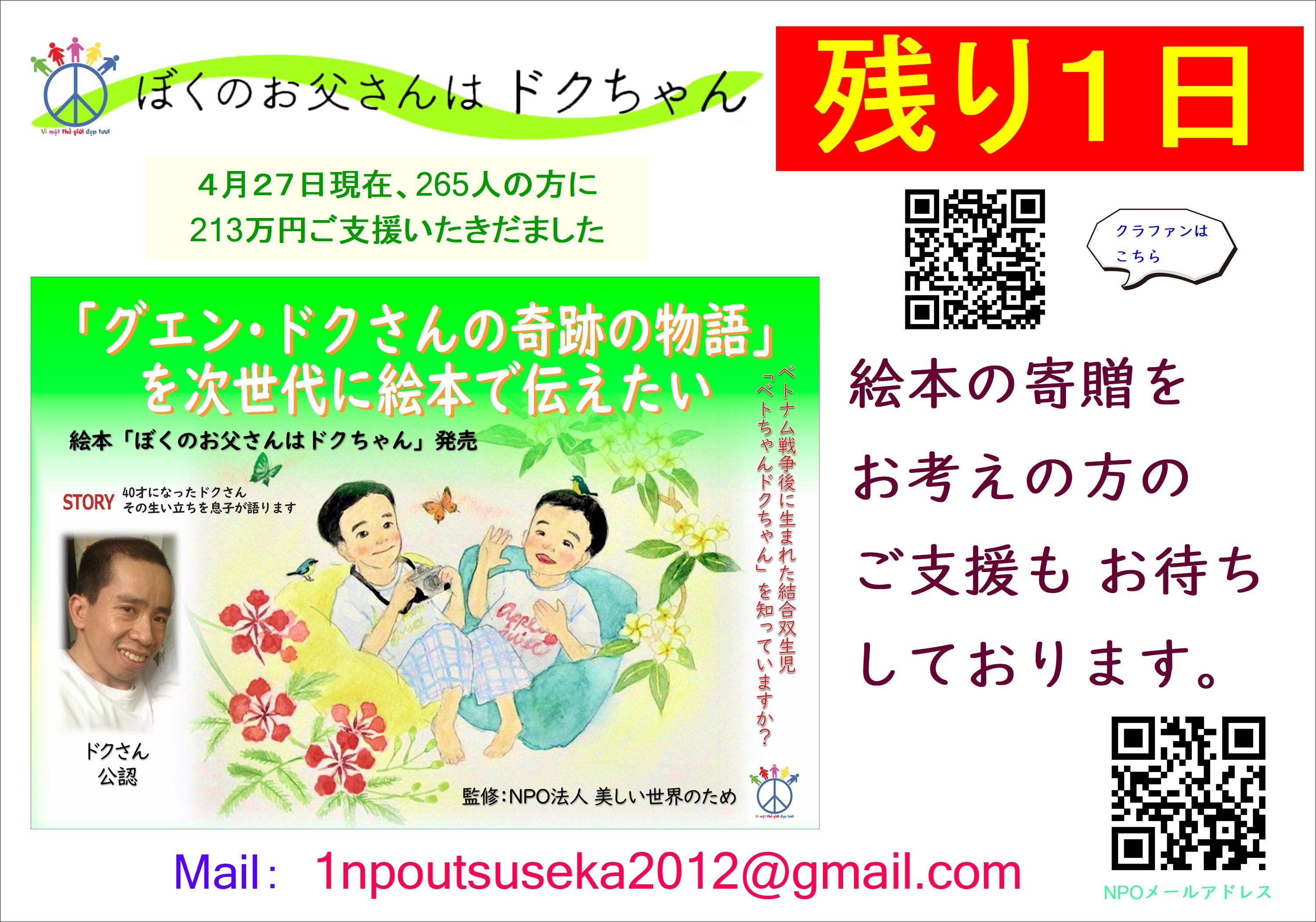 いよいよ4月29日のクラウドファンディング終了まで残り1日ちょっととなりました。
