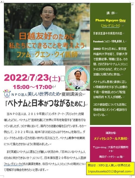 NPO法人美しい世界のためが主催して、日本とベトナムのよりよい関係づくりについて考えるための講演会を、大阪で開催いたします。