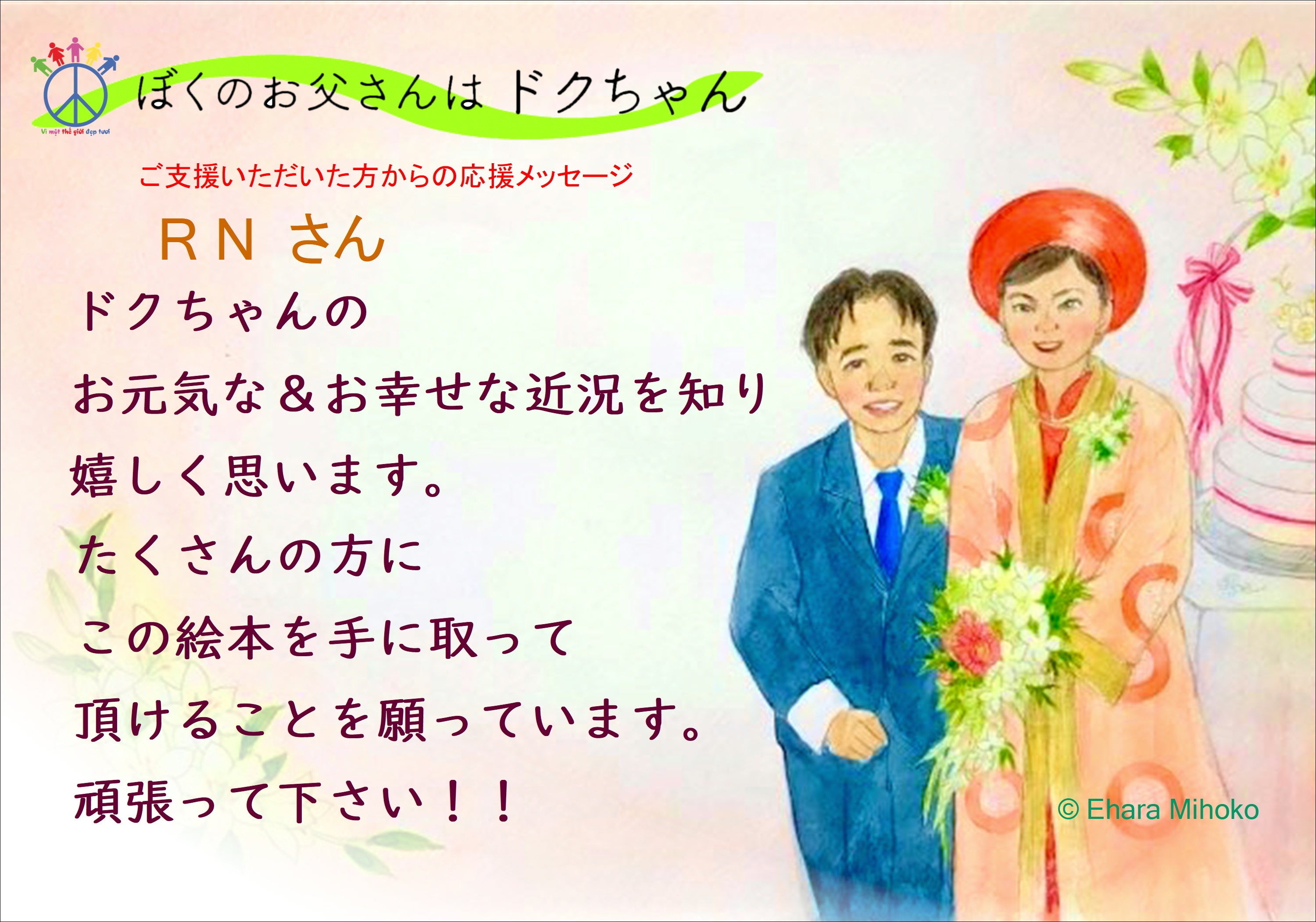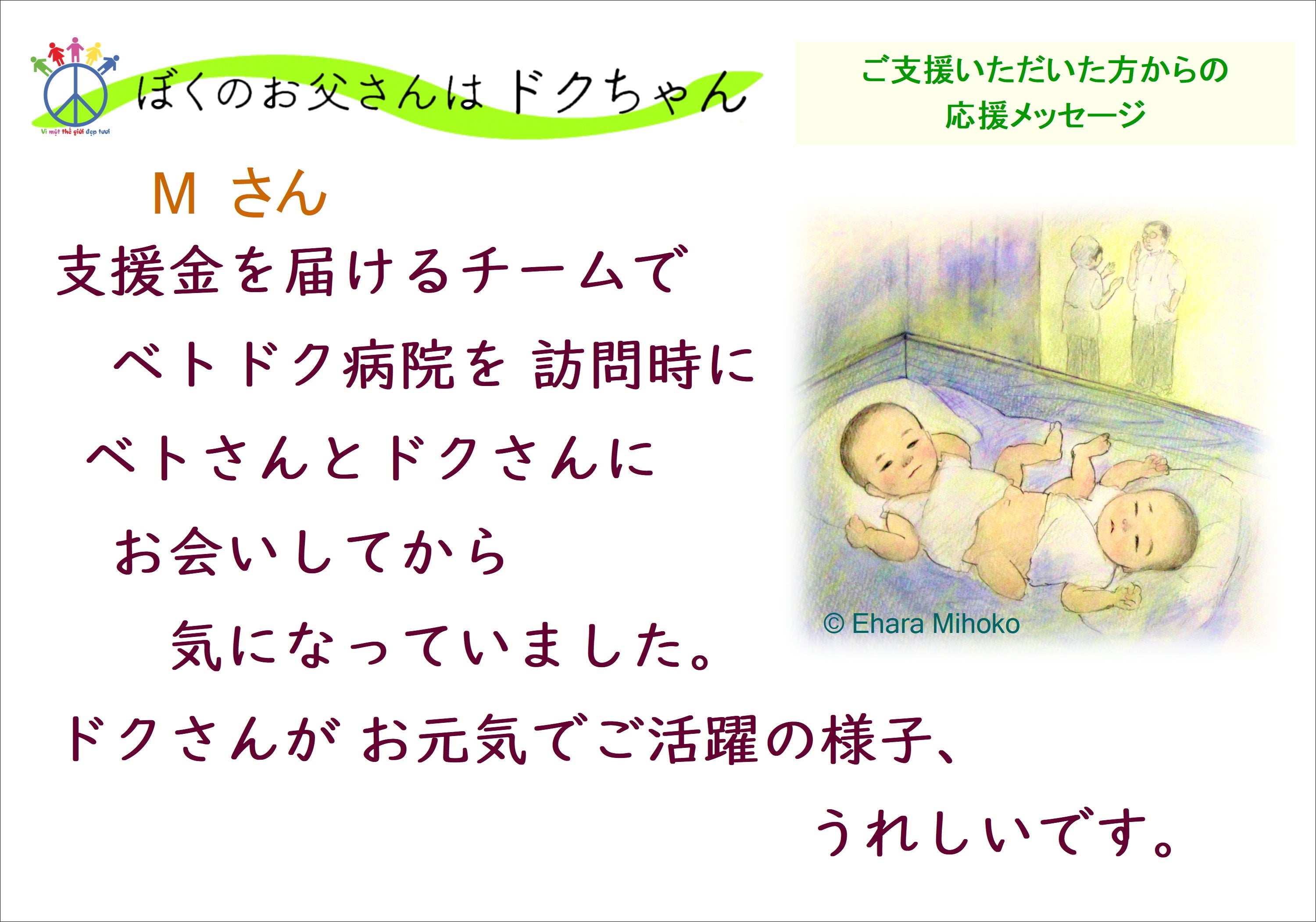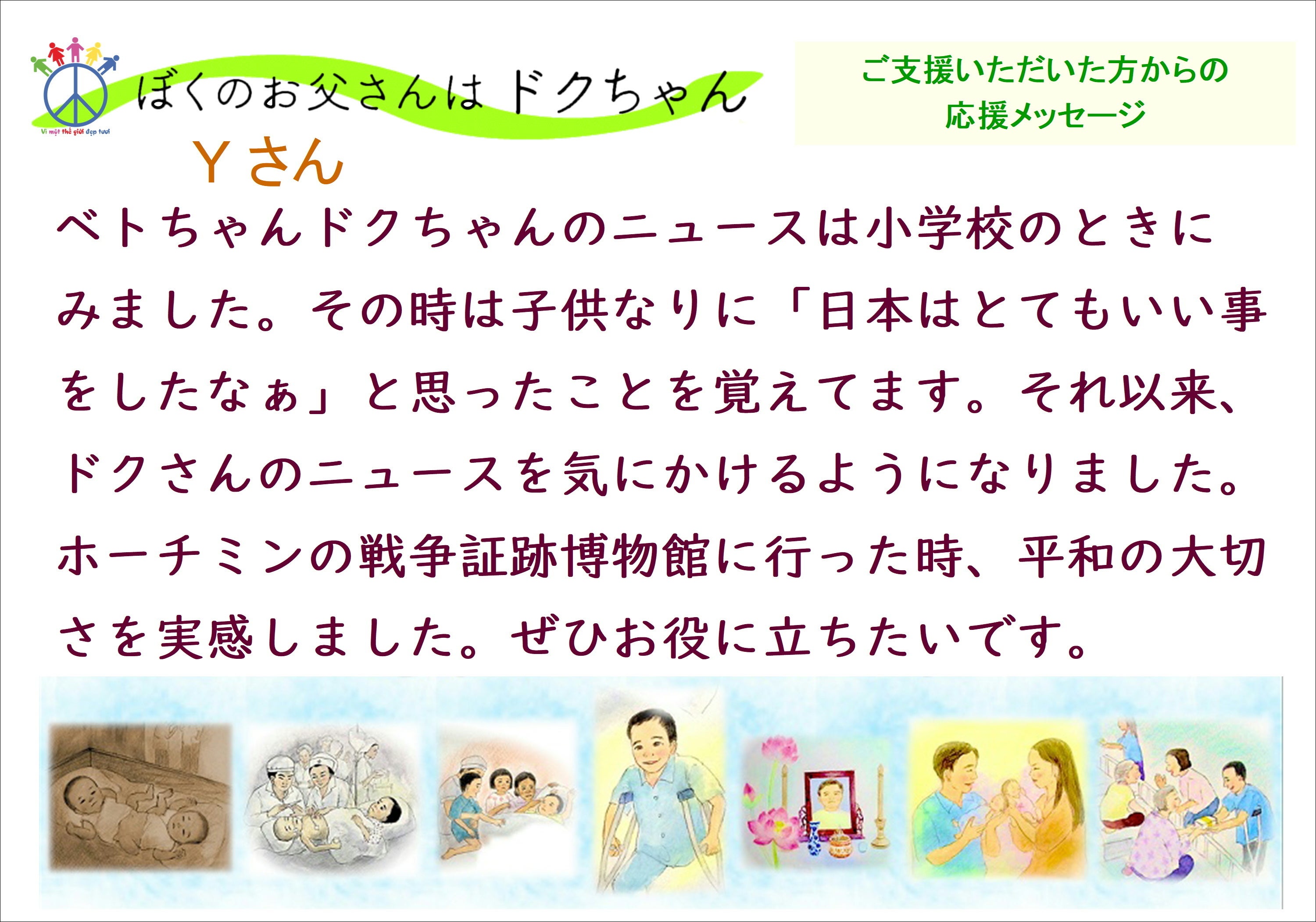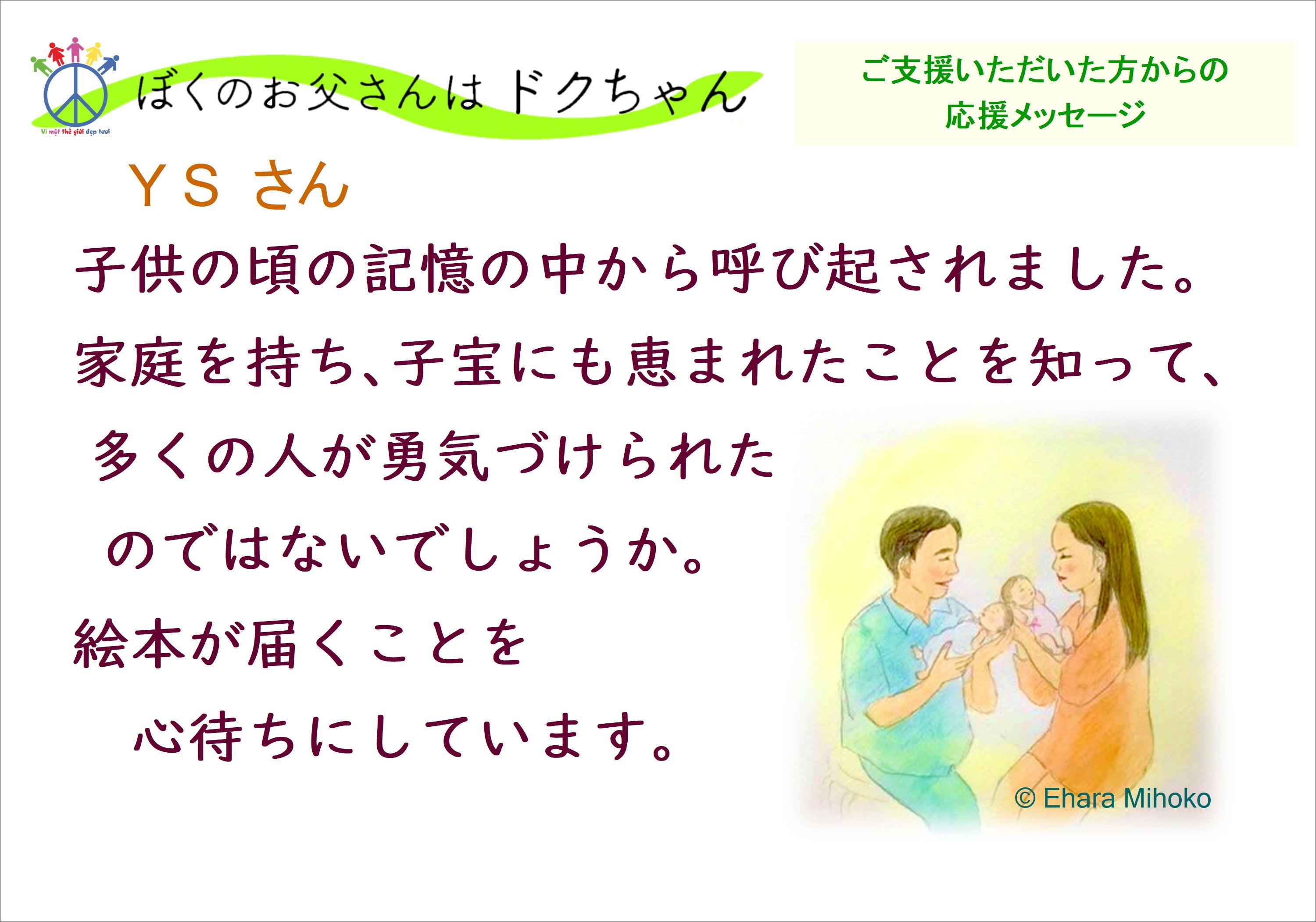 支援者からの応援メッセージを紹介します。大人になったドクちゃんについて、絵本で知ってもらいたいですね。