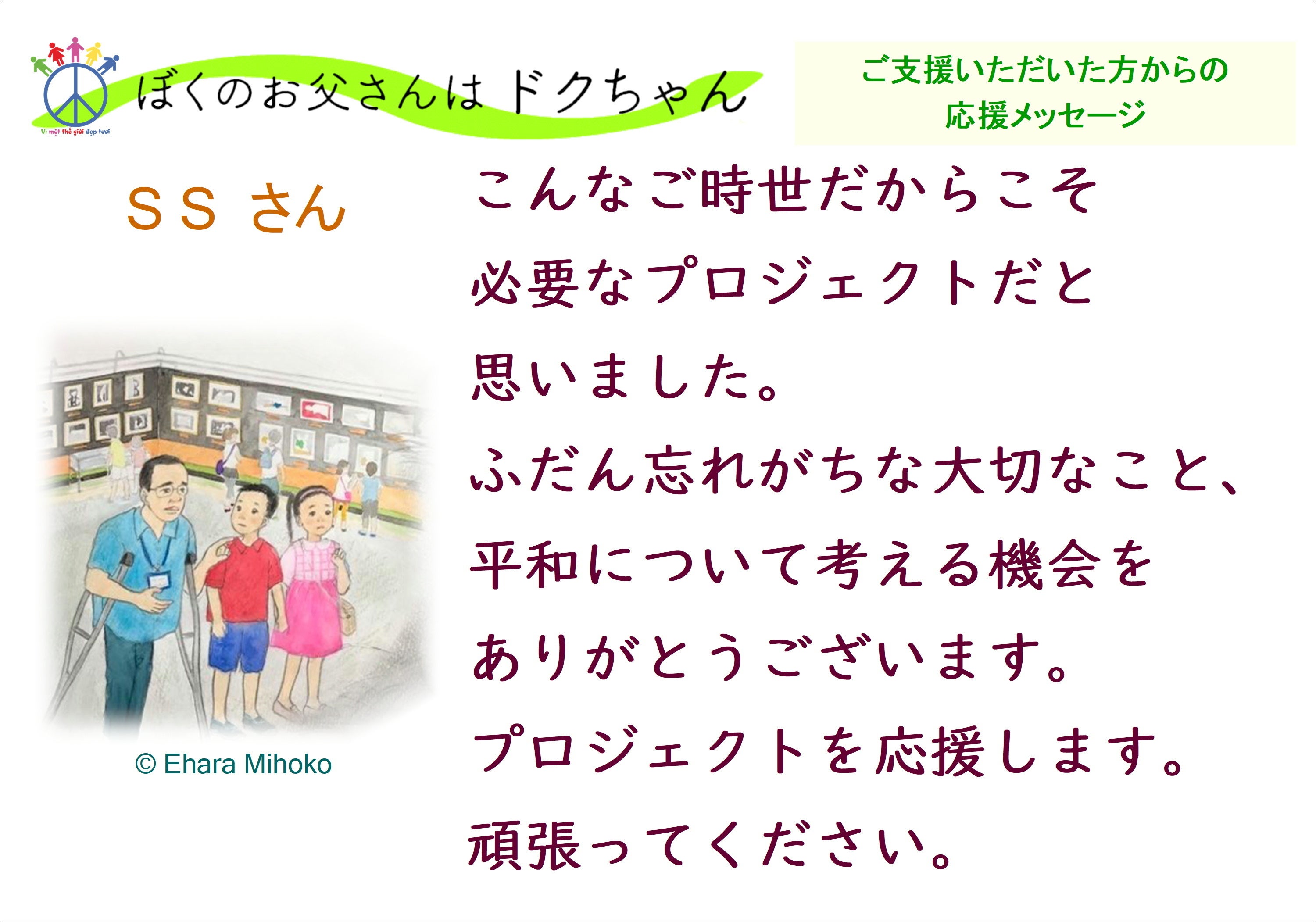 9月21日は国際平和DAY、また、日本とベトナムの外交関係樹立50周年の日でした。平和について考える機会として、かつてみなさまにクラウドファンディングでご支援いただいた絵本「ぼくのお父さんはドクちゃん」をお知り合いに薦めていただけないでしょうか。この度、Amazonでも購入できるようになりました。小学生から読める絵本です。この機会にぜひ、あらためて多くの人に手にとって読んでいただきたいです。https://www.amazon.co.jp/ぼくのお父さんはドクちゃん-文-こじま-えみこ/dp/4910555013