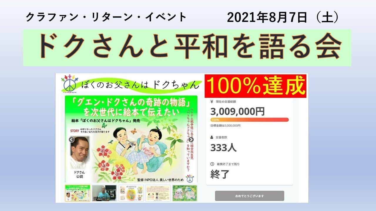 昨日、クラウドファンディングで50口以上支援してくださった方へのリターンとして、「ドクさんと平和を語る会」を、ホーチミン市、石川県金沢市、大阪市の3地点を結んでオンラインで実施しました。イベントの様子については、下のリンクから参照してください。反戦 ドクさんと誓う 金沢の市民団体 ウェブ交流 アメリカ軍が初めて枯葉剤を撒布したのは1961年8月10日と言われており、今年の8月10日でちょうど60年となります。ドクさんは、明日以降も各地の平和イベントにオンラインで参加されるようです。当NPO法人とともにドクさん自身が監修にかかわった絵本「ぼくのお父さんはドクちゃん」について、若い世代に手に取って読んでもらえるように、引き続き、みなさまのご支援をよろしくお願い申し上げます。