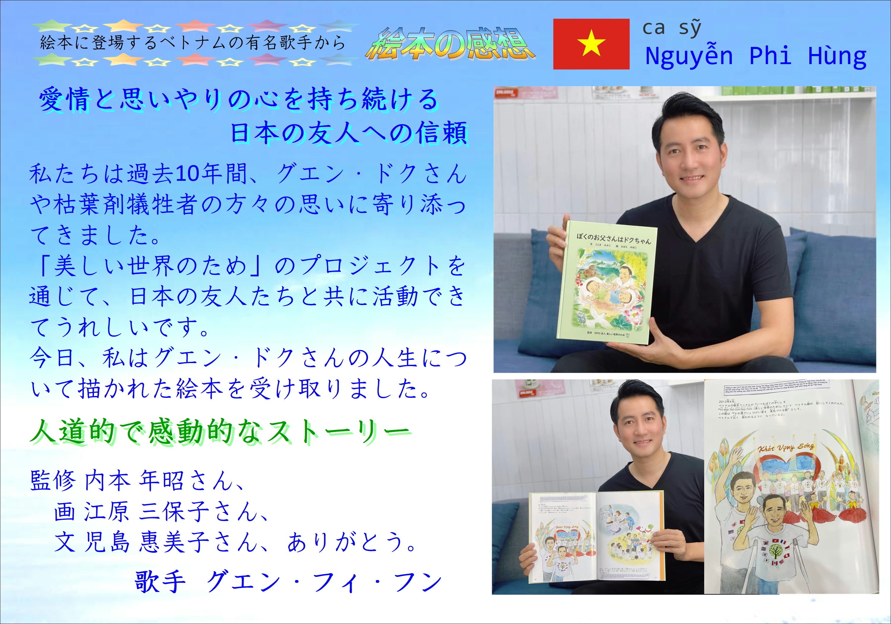 絵本「ぼくのお父さんはドクちゃん」をベトナムに郵送し、現地でベトナム語訳をつけ、ベトナムの関係者の手に、やっと届けられるようになりました。絵本の28頁に登場する歌手のグエン・フィ・フンさんが、“人道的で感動的なストーリー”と賞して、絵本を手にした写真を送ってきてくれました。日本在住のベトナム人留学生らの多くは、歌手のフンさんを知っていても、ドクさんのことを知りません。ベトナム人にも、この絵本の物語を読んでもらいたいと思っています。絵本の購入は、以下のサイトからできます。https://www.medisere.co.jp/mediserebook/sp/