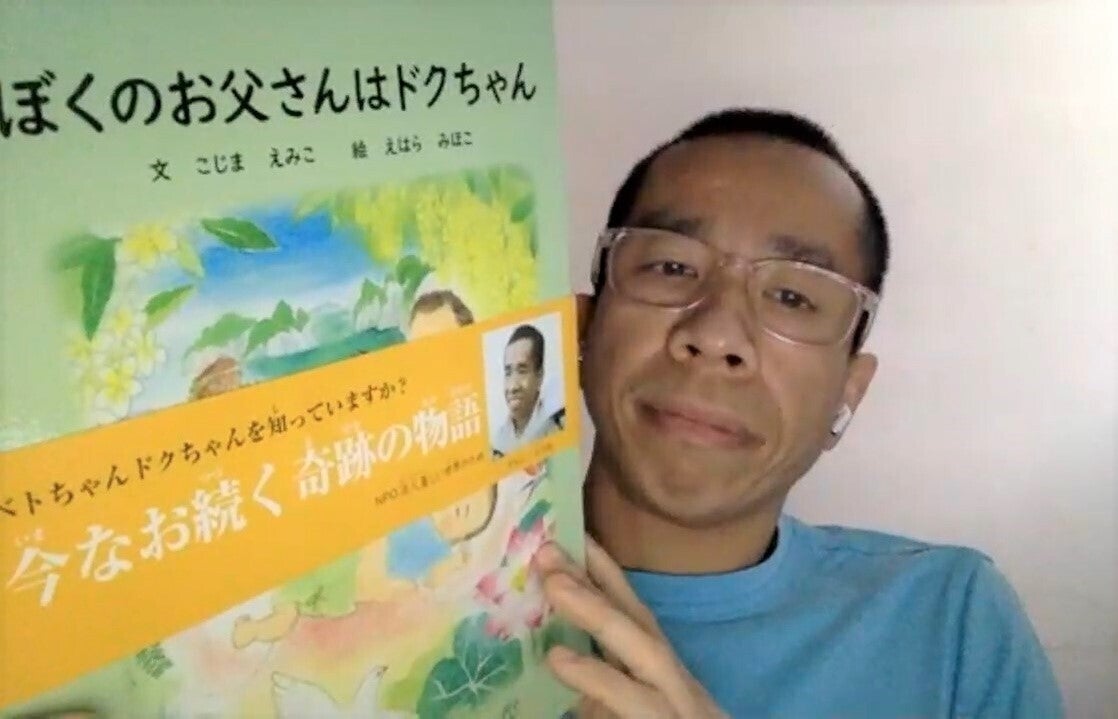 2021年11月14日、特定非営利活動法人ベトナム医療教育介護福祉協力会(前身:ベトちゃんとドクちゃんの発達を願う会)の総会の途中、「絵本でつながる交流会」と題して、ベトナムからオンラインでグエン・ドクさんが講演しました。ドクさんは、絵本の制作段階で絵や文に目を通して監修してくれていましたが、実際に完成した絵本を手にしてから公の場で絵本についての感想を述べるのは初めてでした。以下、ドクさんの語った内容の抜粋です。「この絵本が発行されて とても嬉しかったです。私の夢の一つが実現されました。」「わかりやすい文、素敵な絵、子どもから大人までの読者が 枯葉剤被害について わかりやすく理解できる教育的な本」「この絵本は、私の本当のことを書いてくれている。この本を通じて、困っている人たちを助けられるんじゃないかと思いました。」なお、ドクさんは、将来的には自分の手で自分のことを書きたいという夢もあるそうです。絵本「ぼくのお父さんはドクちゃん」については、以下のサイトから購入できます。https://www.medisere.co.jp/mediserebook/