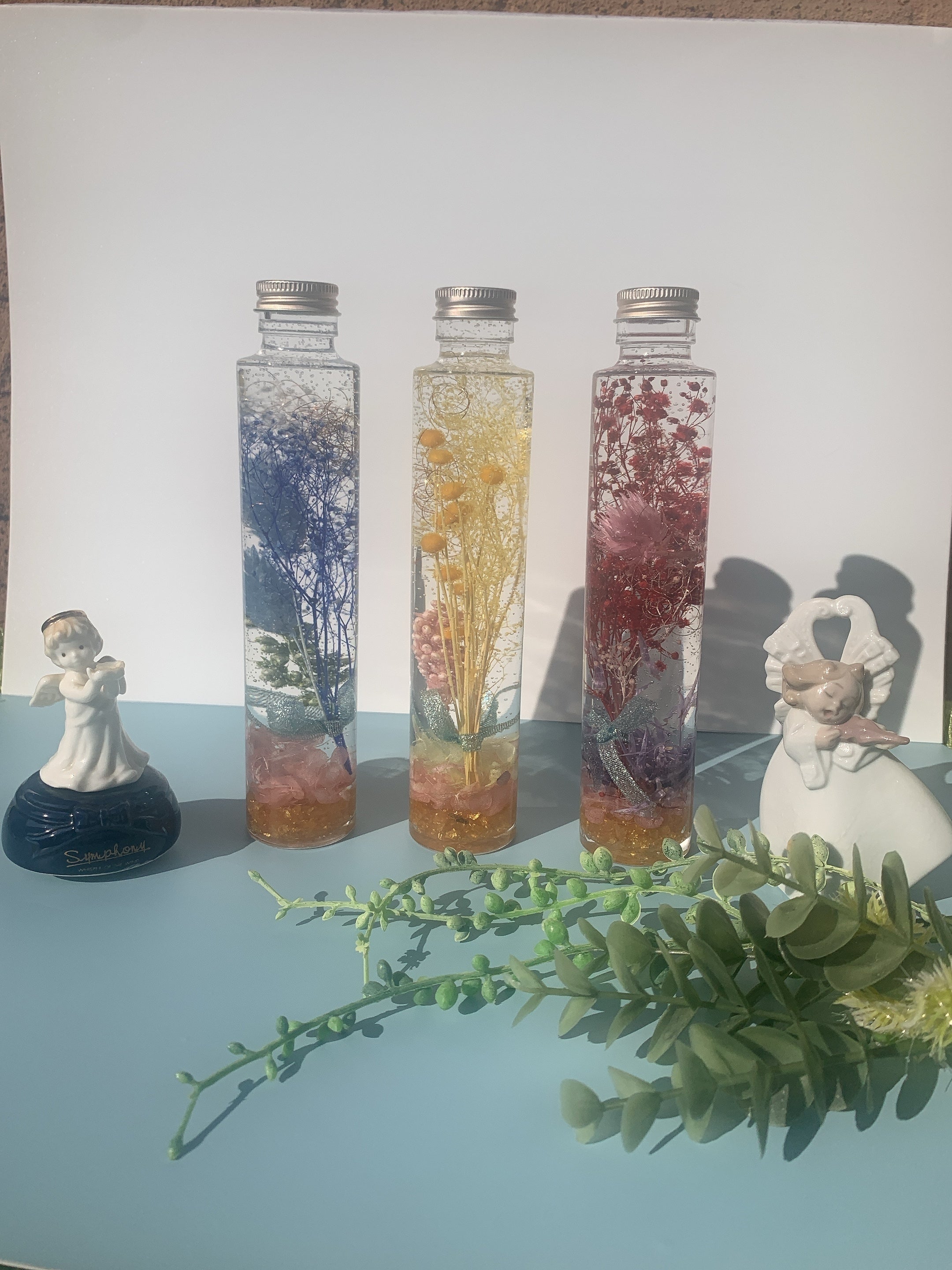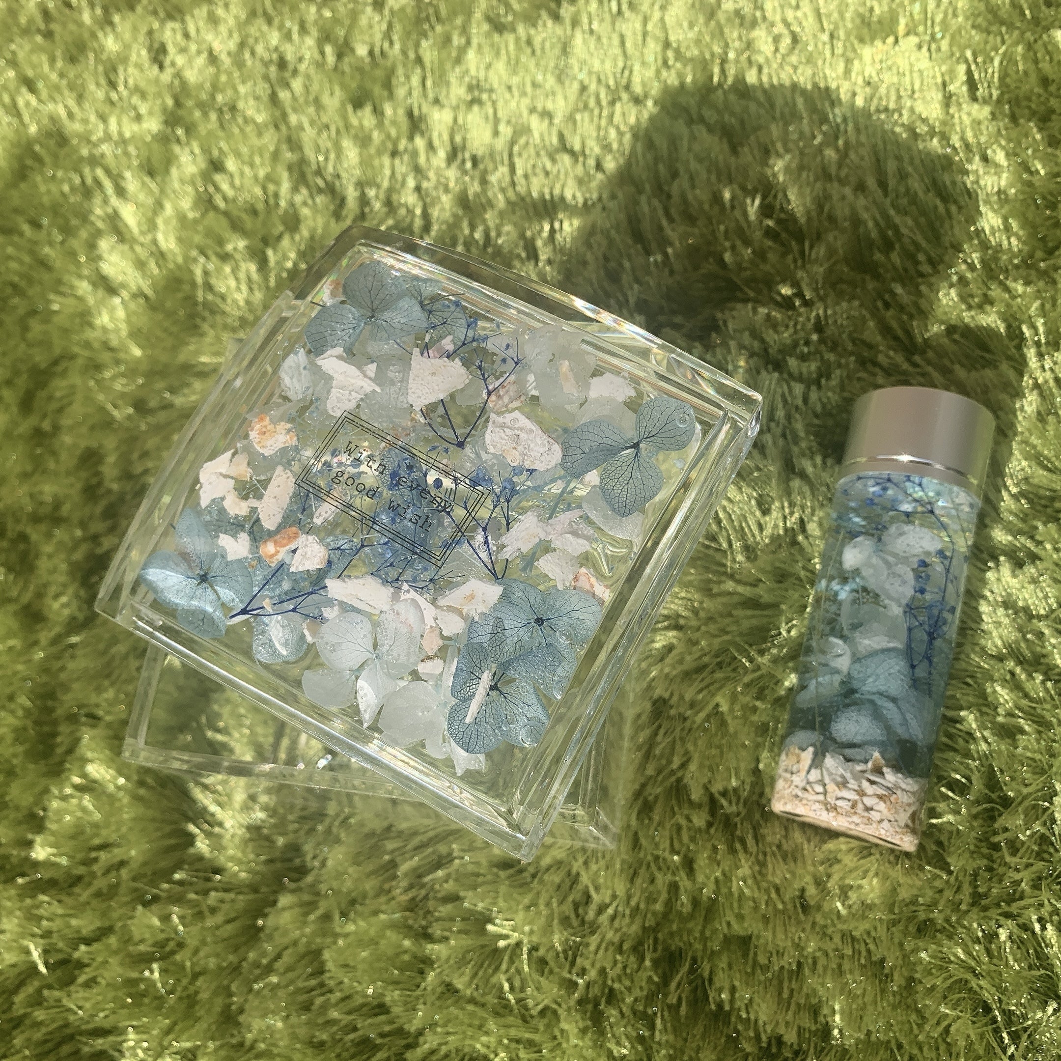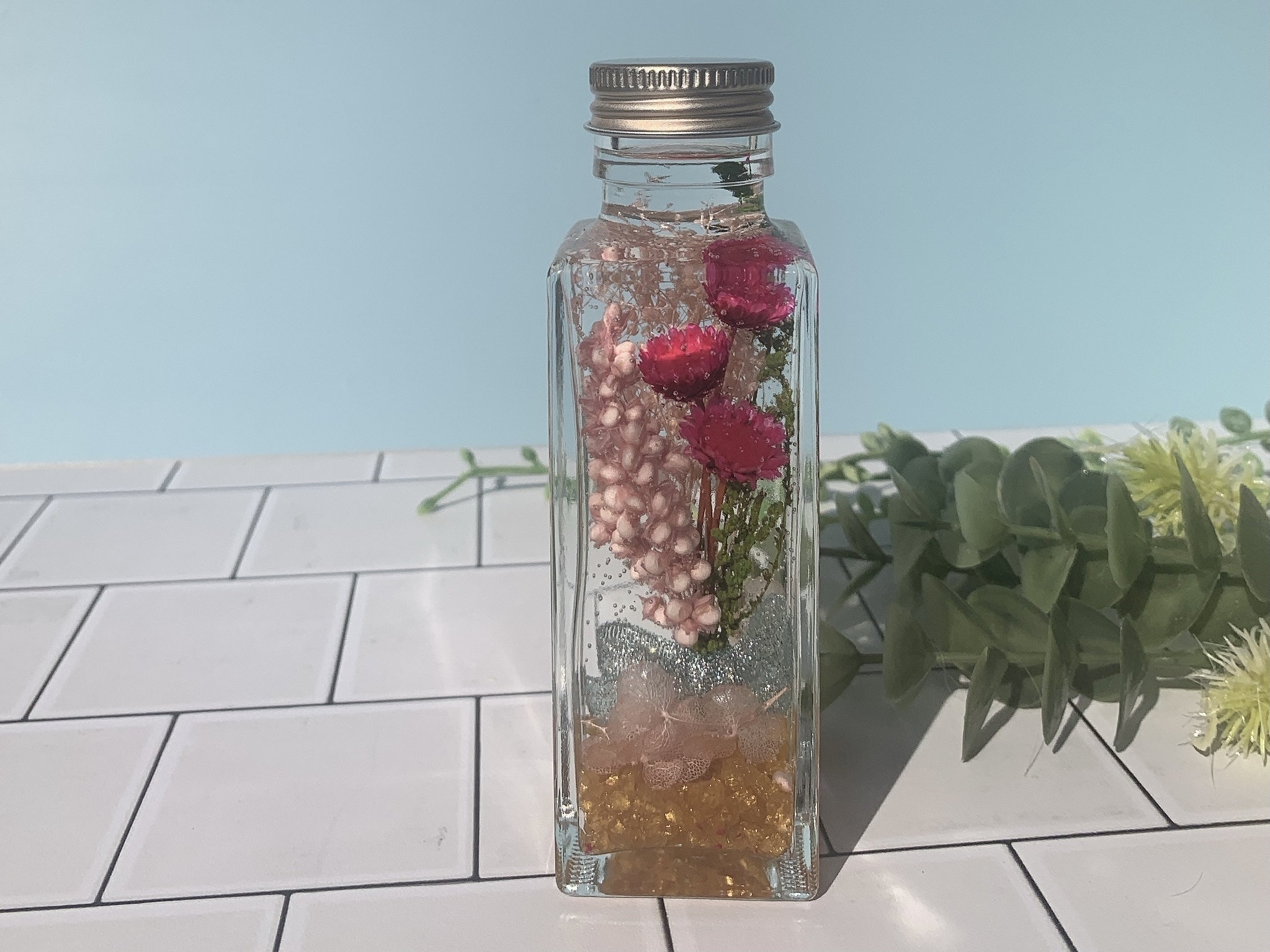 珊瑚のように美しく真っ白で、ボトルの中で樹脂で固めその上にかわいいお花をハーバリウム調にあしらっておりますので、インテリアとしてもたいへん馴染むデザインとなっております。