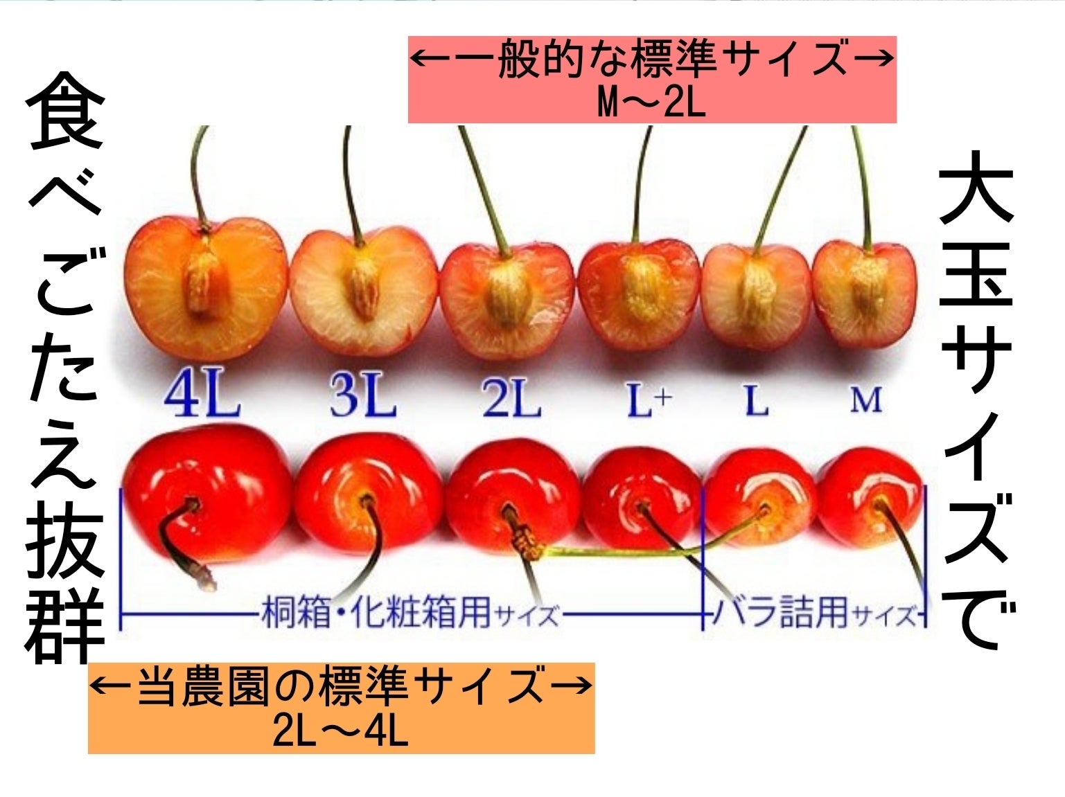 私達のさくらんぼは2L以上を主としており、2L・Lサイズ混合を”特秀”、3L・2Lサイズ混合を”超特秀”という規格分けをして販売しています。大粒なので見た目はかなりのインパクトがあり、果肉は分厚くしっかりした食感で、見た目に比例したインパクトのある甘さに、佐藤錦ならではの酸味がプラスされ、口に入れた瞬間にはじける果汁が癖になります。