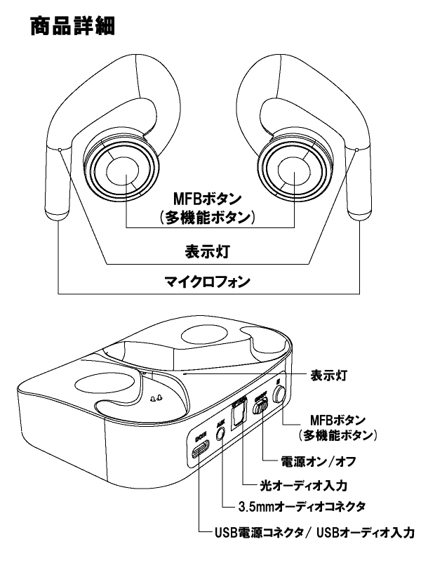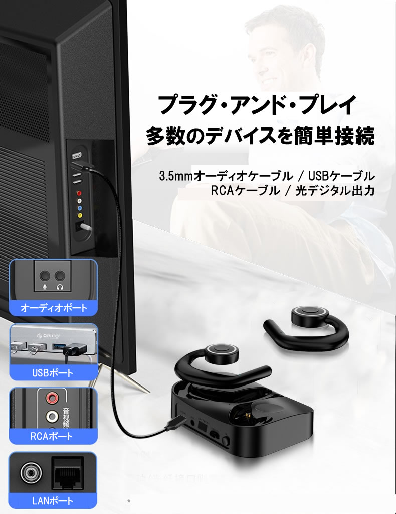 送信機はオープンイヤーイヤホンだけではなくその他のスピーカーやヘッドホンなどにも接続が可能です。