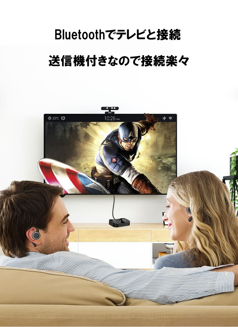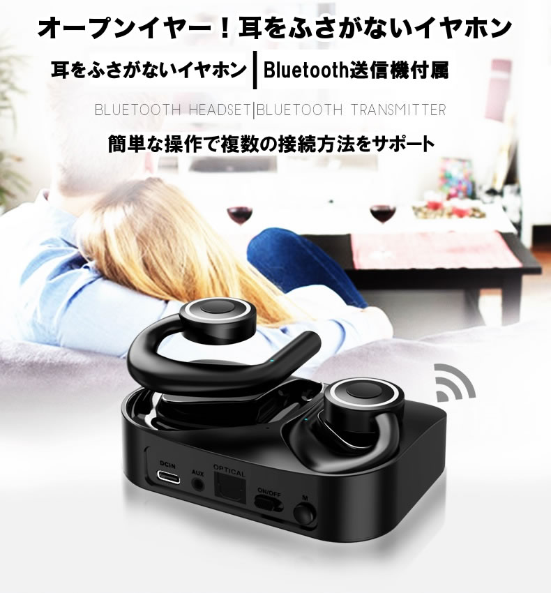 テレビにつないだ送信機から耳掛け式のオープンイヤーイヤホンにBluetoothで接続が出来ます。