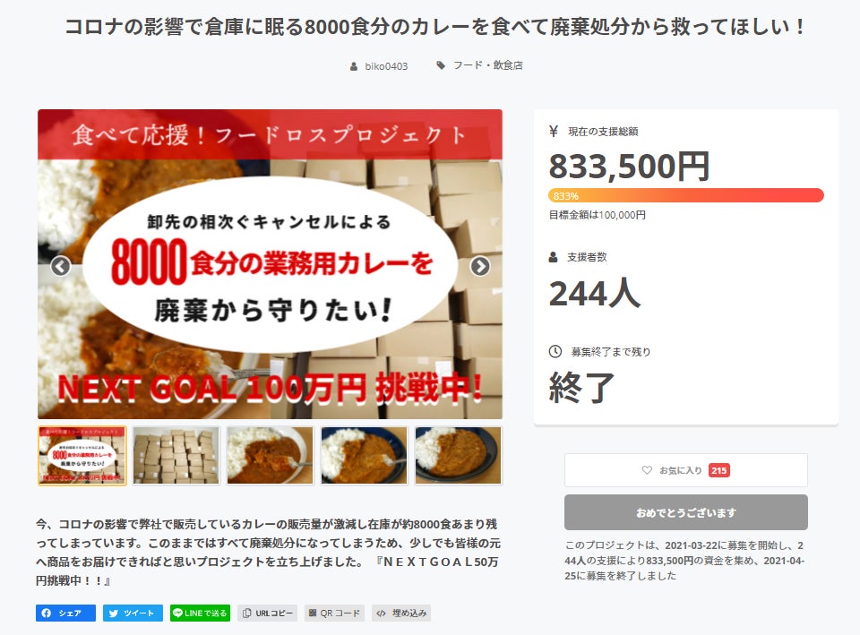 目標金額の達成で、1/10にあたる約600個あまりのカレーを、廃棄から救う事ができたと同時に、皆さまに美味しいカレーをお届けできたことを大変嬉しく思います。