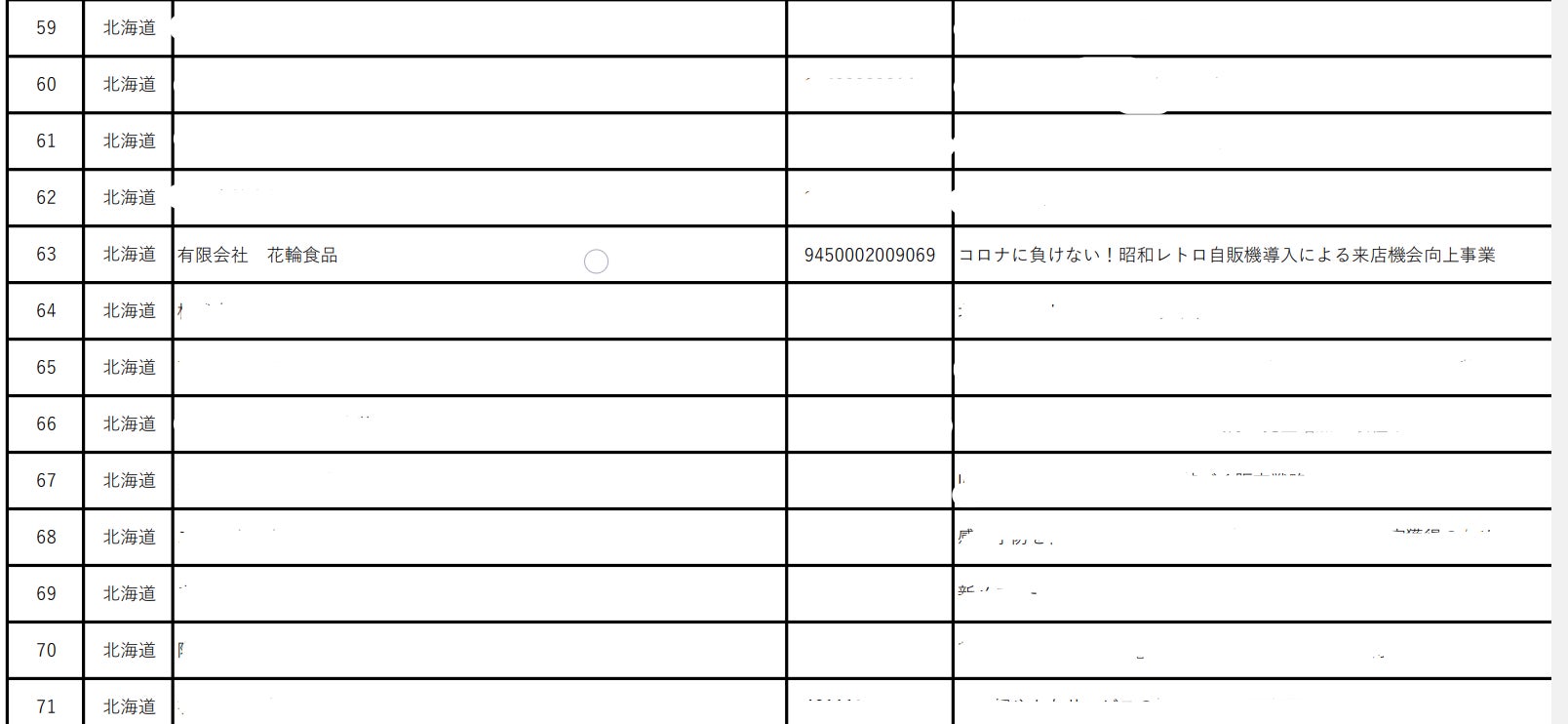 補助金のHPで確認できる採択事業者一覧。ほかの事業者様の欄の内容は消してあります。