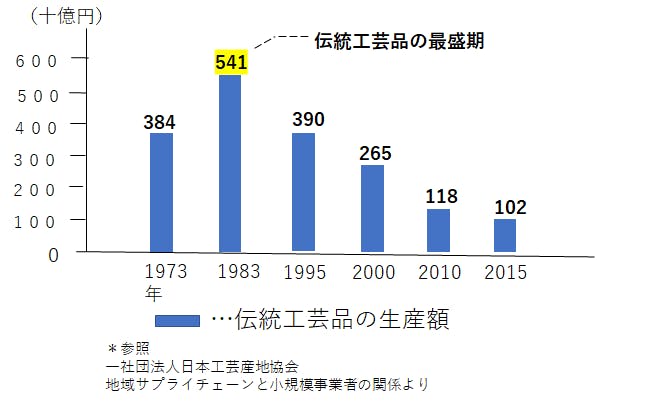 伝統的工芸品産業復興協会によると、伝統工芸品の生産額のピークは1983年。そこから年々減少し、2015年の生産額は1,020億円と最長期の1983年から1/5の水準まで落ち込んでいるそうです。