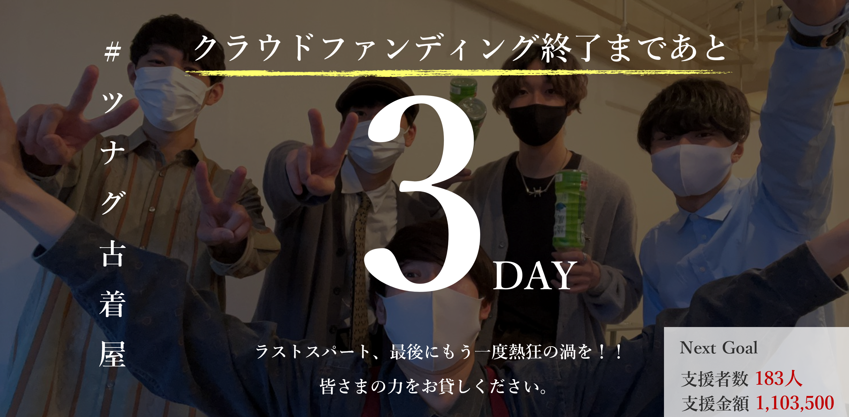 クラウドファンディングを達成しました!!!!ありがとうございます!!!!達成したことを知ったときは、みんな「うぉ~~~~~!!!やった~~~~~!!!!」と叫んで、メンバー全員語彙力を失い、「やばい、えぐい」以外の言葉を失っていました(笑)”ツナグ”をコンセプトに古着屋を創りたい!と始まったこのプロジェクトに多くの方々に共感していただき、皆様からの温かい応援があったからこそ、なんとか成し遂げることが出来ました。ありがとうございます。このクラファンでは、自分たちにとってほとんどが初めての経験で能力の無さを感じ、順調にはいかないことだらけで、不安と焦りを日々感じていました。しかし、出来ない理由を探すより前に出来る理由を探そう”とにかく行動”しようとガムシャラな代表に引っ張られてメンバー全員でコツコツと頑張り続けることが出来ました。そんな僕たちを応援してくださっている皆様、本当にありがとうございます。感謝をしてもしきれません。応援してくれる皆様がいなかったら、ここまで来ることは絶対にありえなかったです。古着屋『troika』のクラファン終了まで、残り5日あります。当初の目標は達成しましたが、最後までメンバー全員で走り切ります!古着屋『troika』の序章がスタートしました。もっともっと、人との”ツナガリ”の輪を大きくしたい!そんな想いからNext goalを定めました。このNext goalに向かって、最後まで走り切ります。▼目標支援者数 200人▼目標金額   1,200,000円最後までやり切ります!引き続き応援よろしくお願いいたします!!!