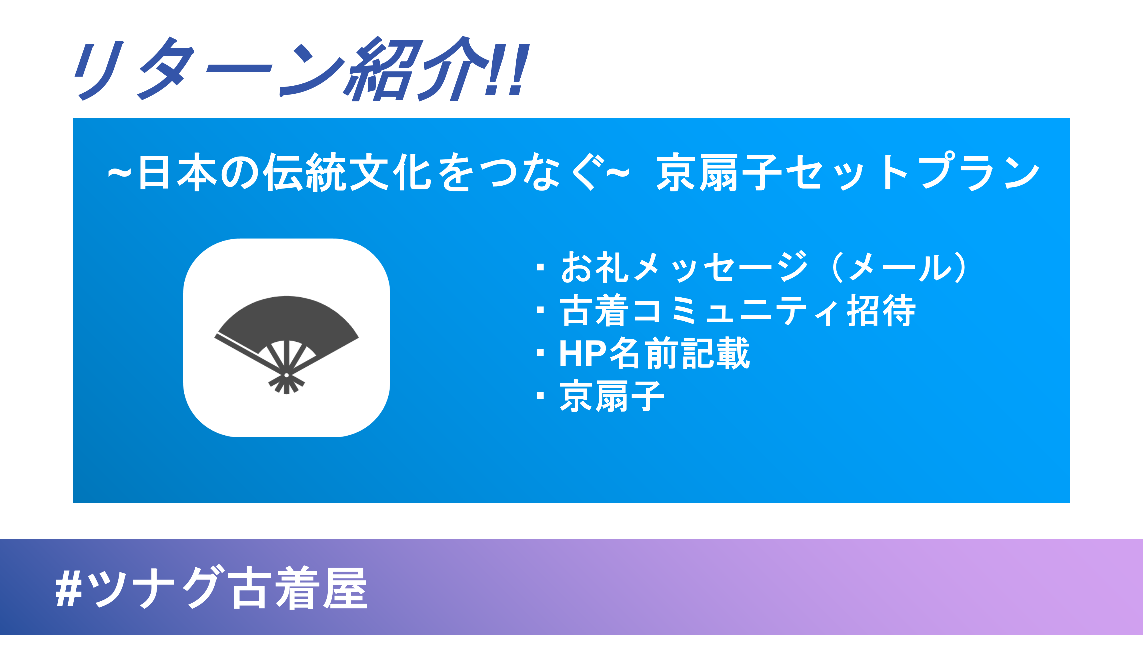 皆さんこんにちは。ツナグ古着屋『troika』のクラウドファンディングも残すところ18日となりました現在 《支援金額 644,000円 支援者数 116名》支援者数が110人を超えてとても興奮しております。本当にありがとうございます。応援コメントでいつも力をもらってます。今回のクラウドファンディングの各リターンの魅力について紹介していきます!【株式会社山武扇舗提供!伝統文化を守るプラン】▼リターン内容・お礼メッセージ・古着コミュニティ招待・HP名前入れる・男性向け京扇子こちらのリターンの残り個数が「男性向け6個、女性向け9個」となっております。京都の山武扇舗さんとのコラボ商品である『京扇子』男性向けの商品と女性用の商品の二つを用意させて頂いております。男性向けの扇子はサイズが大きく、色が青色です。また、コラボ商品ということで、『troika』の文字をさりげなく入れて頂いております。《山武扇舗さんは創業百余年の老舗で、歴史ある京扇子を提供しています♪》これからの熱い季節には扇子を1つ持っているだけで、お洒落です!「クラファンを応援しながら、京都の文化とツナガル」というのはいかがでしょうか。引き続き頑張ってまいりますので、最後まで応援よろしくお願いします。