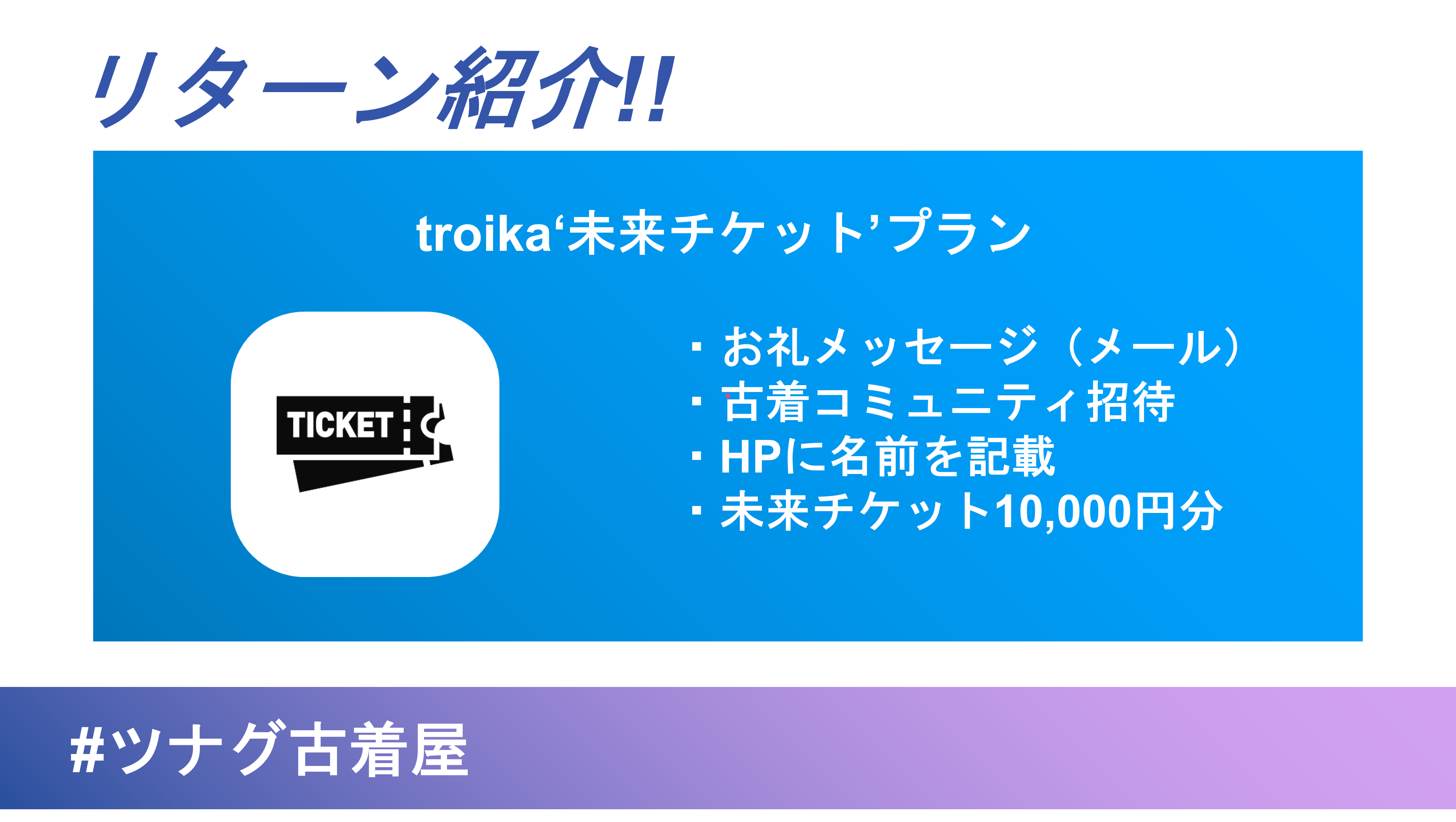 皆さんこんにちは。ツナグ古着屋『troika』のクラウドファンディングも残すところ17日となりました。現在 《支援金額 660,000円 支援者数 120名》支援者数120名を達成しました!!!本当にありがとうございます。応援コメントでいつも元気をもらってます。それでは、クラウドファンディングの各リターンの魅力について紹介していきます!【troikaの未来チケットプラン】▼リターン内容・お礼メッセージ・古着コミュニティ招待・HP名前入れる・未来チケット10,000円分こちらのリターンの最大の魅力はなんといっても10,000円分の商品券です!8,000円で10,000円分の商品が買えるなんて、かなりお得です。このリターンに関しては、赤字覚悟で出させてもらってます(笑)多くの人に『troika』に足を運んでいただきたい古着を通じて多くの人と「ツナガリ」たいという想いをこのリターンに込めています。こちらのリターンの残り個数が15個になっており、クラウドファンディング限定です。「個数が限られたリターンとなっておりますので、早いモノ勝ちです。」引き続き古着屋『troika』設立に向け、頑張ってまいりますので応援よろしくお願いします!!!