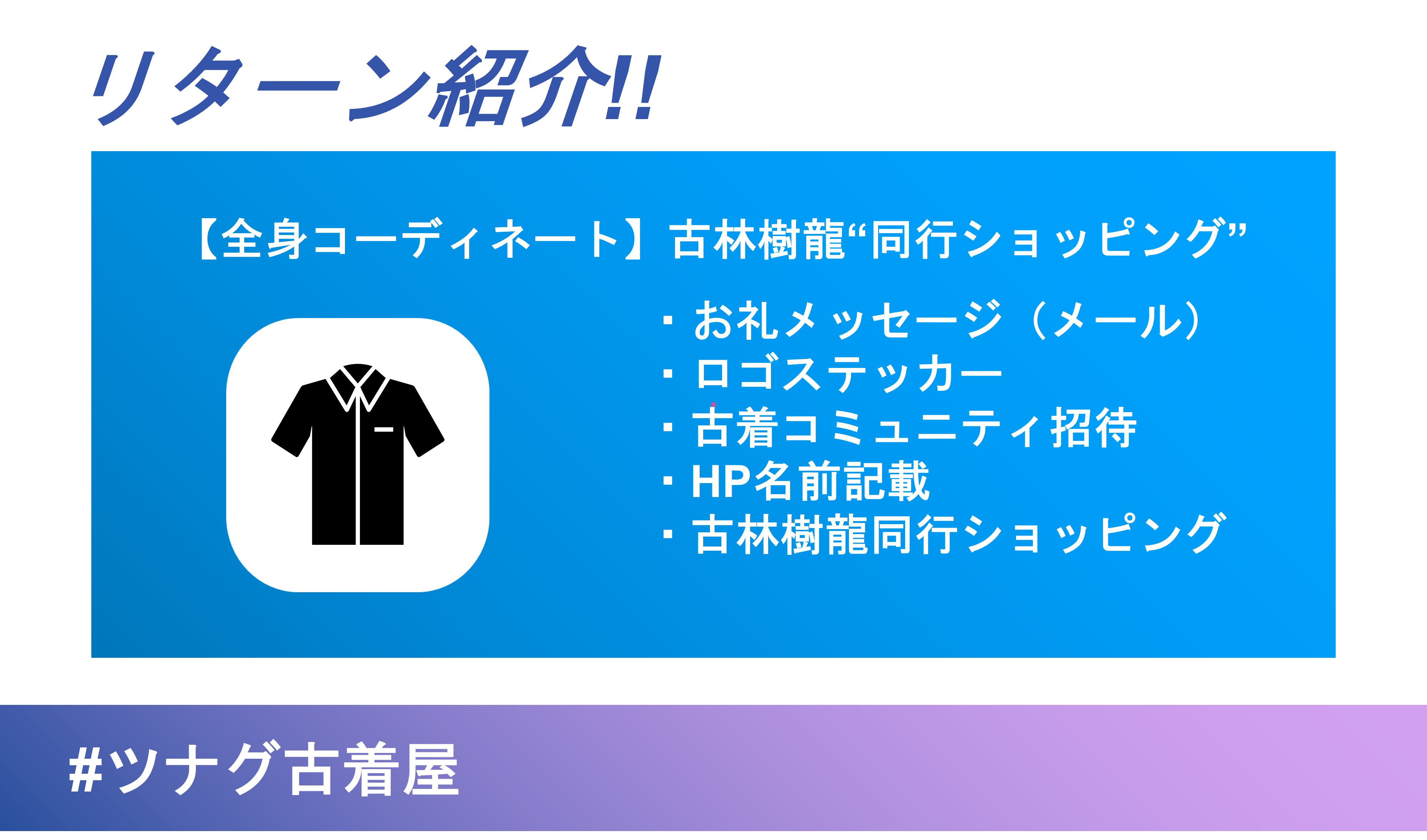 皆さんこんにちは。ツナグ古着屋『troika』のクラウドファンディングの挑戦も残すところ「15日」となりました。現在 《支援金額 697,000円 支援者数 127名》支援者数もありがたいことに、じわじわと増えております!!!応援コメントのおかげで日々、1歩ずつ進むことが出来ています。本当にありがとうございます。それでは、クラウドファンディングの各リターンの魅力について紹介していきます!【全身コーディネート!古林樹龍と同行ショッピングプラン】▼内容・お礼メッセージ・ゲリラ割引情報コミュニティ招待券・HP名前入れる・古林樹龍と2時間同行ショッピングいつも元気で『troika』メンバーを盛り上げてくれる樹龍との同行ショッピング!!!京都の古着屋が大好きな樹龍と一緒にショッピングをすれば、「あなただけの1着に”ツナガル”かもしれません」京都の古着屋のことをよく知らないという方でも、樹龍が案内してくれるので安心です!!!こちらのリターンは数に制限があり、限定”10個”となっております!早い者勝ちです(笑)古着屋『troika』のクラウドファンディングも気付けば残り「15日」引き続き頑張ってまいりますので、最後まで応援よろしくお願いします。