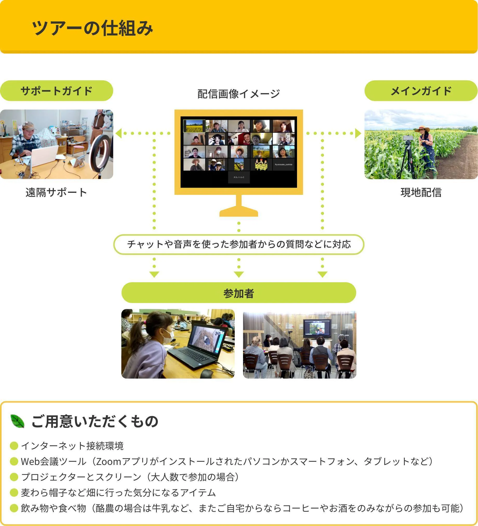 そこで運営面を改善し、サポートガイドが通信環境の安定した場所からつなぐことにしました。農場からの通信が途切れてしまう間に写真や動画等で解説したり、参加者の質問に回答したりする等、フォローする仕組みが整っていきました。